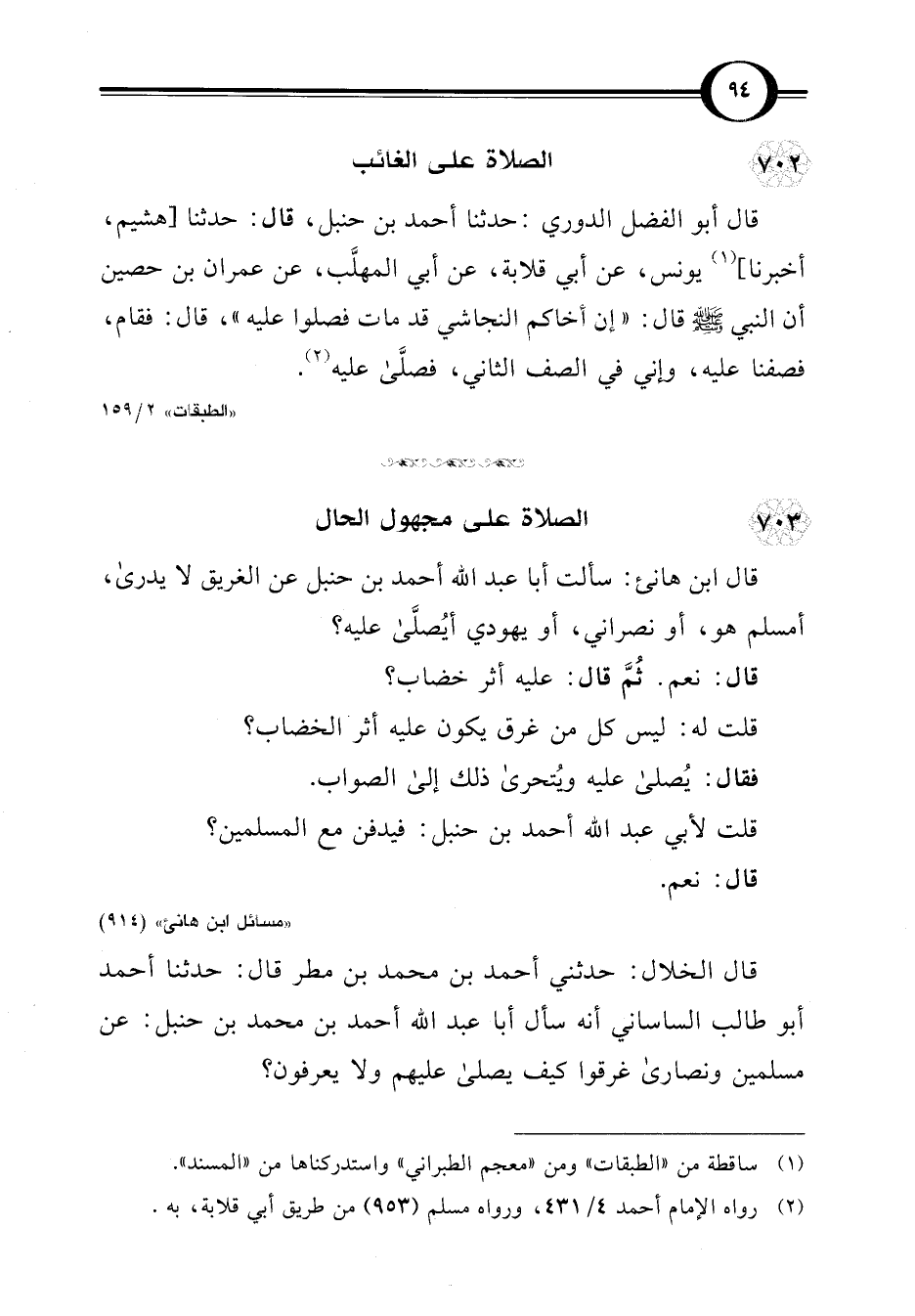 قال أبو الفضل الدوري: حدثنا أحمد بن حنبل، قال: حدثنا [هشيم، أخبرنا] (¬1) يونس، عن أبي قلابة، عن أبي المهلَّب، عن عمران بن حصين أن النبي -صلى اللَّه عليه وسلم- قال: "إن أخاكم النجاشي قد مات فصلوا عليه"، قال: فقام، فصفنا عليه، وإني في الصف الثاني، فصلَّى عليه (¬2).