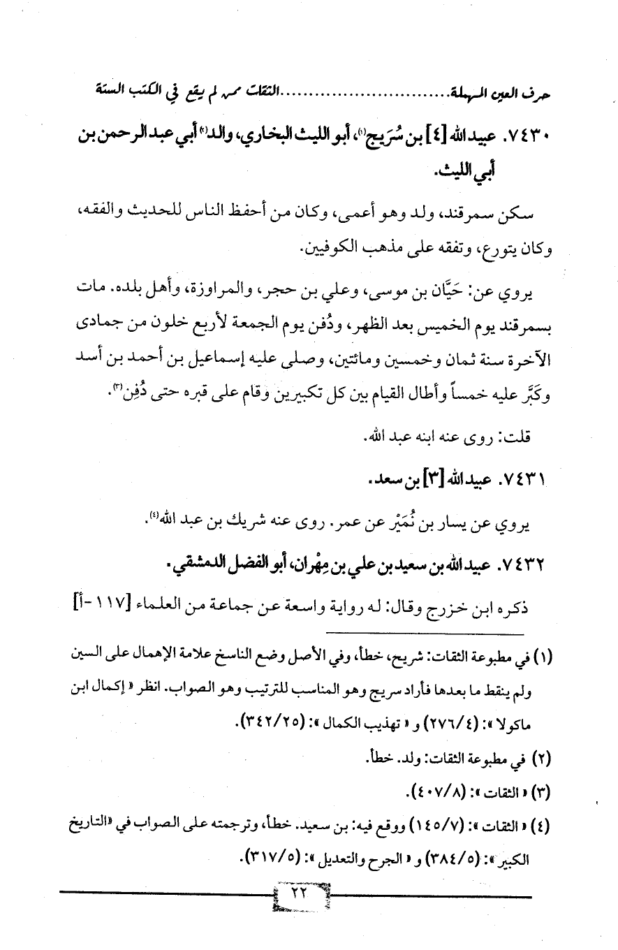 (¬4) «الثقات»: (7/ 145) ووقع فيه: بن سعيد. خطأ، وترجمته على الصواب في «التاريخ الكبير»: (5/ 384) و «الجرح والتعديل»: (5/ 317).