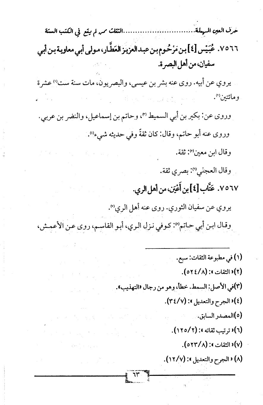 7566 - عُبَيْس [4] بن مَرْحُوم بن عبد العزيز العَطَّار، مولى أبي معاوية بن أبي سفيان، من أهل البصرة.