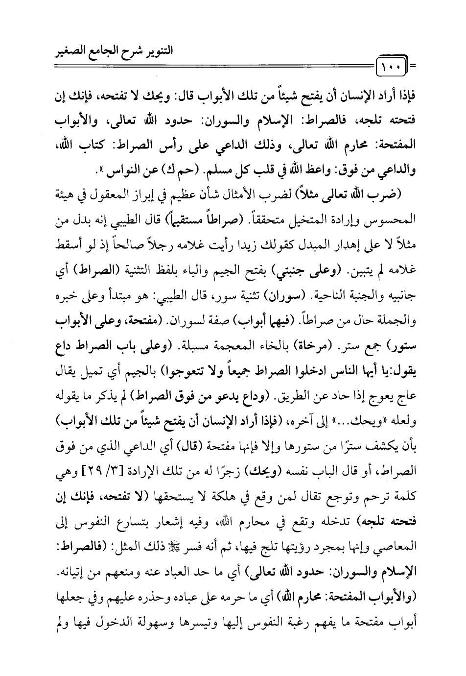 (ضرب الله تعالى مثلاً) لضرب الأمثال شأن عظيم في إبراز المعقول في هيئة المحسوس وإرادة المتخيل متحققاً. (صراطاً مستقيماً) قال الطيبي إنه بدل من مثلاً لا على إهدار المبدل كقولك زيدا رأيت غلامه رجلاً صالحاً إذ لو أسقط غلامه لم يتبين. (وعلى جنبتي) بفتح الجيم والباء بلفظ التثنية (الصراط) أي جانبيه والجنبة الناحية. (سوران) تثنية سور، قال الطيبي: هو مبتدأ وعلى خبره والجملة حال من صراطاً. (فيهما أبواب) صفة لسوران. (مفتحة، وعلى الأبواب ستور) جمع ستر. (مرخاة) بالخاء المعجمة مسبلة. (وعلى باب الصراط داع يقول: يا أيها الناس ادخلوا الصراط جميعاً ولا تتعوجوا) بالجيم أي تميل يقال عاج يعوج إذا حاد عن الطريق. (وداع يدعو من فوق الصراط) لم يذكر ما يقوله ولعله "ويحك ... " إلى آخره، (فإذا أراد الإنسان أن يفتح شيئاً من تلك الأبواب) بأن يكشف سترًا من ستورها وإلا فإنها مفتحة (قال) أي الداعي الذي من فوق الصراط، أو قال الباب نفسه (ويحك) زجرًا له من تلك الإرادة [3/ 29] وهي كلمة ترحم وتوجع تقال لمن وقع في هلكة لا يستحقها (لا تفتحه، فإنك إن فتحته تلجه) تدخله وتقع في محارم الله، وفيه إشعار بتسارع النفوس إلى المعاصي وإنها بمجرد رؤيتها تلج فيها، ثم أنه فسر - صلى الله عليه وسلم - ذلك المثل: (فالصراط: الإسلام والسوران: حدود الله تعالى) أي ما حد العباد عنه ومنعهم من إتيانه. (والأبواب المفتحة: محارم الله) أي ما حرمه على عباده وحذره عليهم وفي جعلها أبواب مفتحة ما يفهم رغبة النفوس إليها وتيسرها وسهولة الدخول فيها ولم