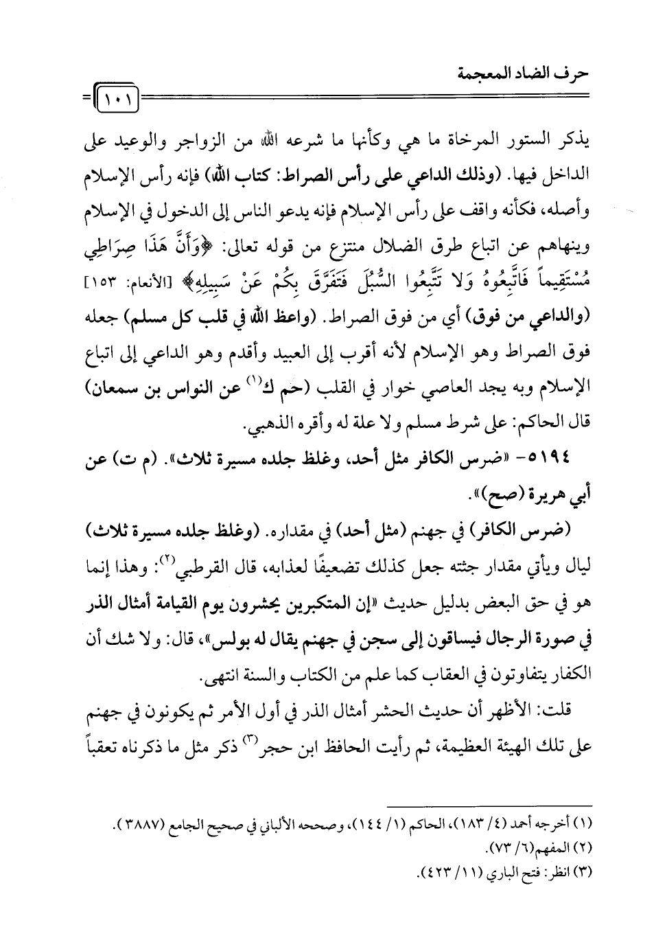 5194 - "ضرس الكافر مثل أحد، وغلظ جلده مسيرة ثلاث". (م ت) عن أبي هريرة (صح) ".
