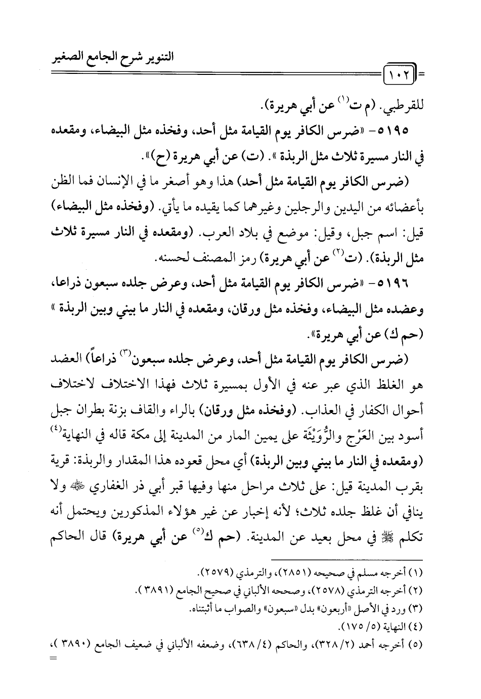 5195 - "ضرس الكافر يوم القيامة مثل أحد، وفخذه مثل البيضاء، ومقعده في النار مسيرة ثلاث مثل الربذة". (ت) عن أبي هريرة (ح) ".