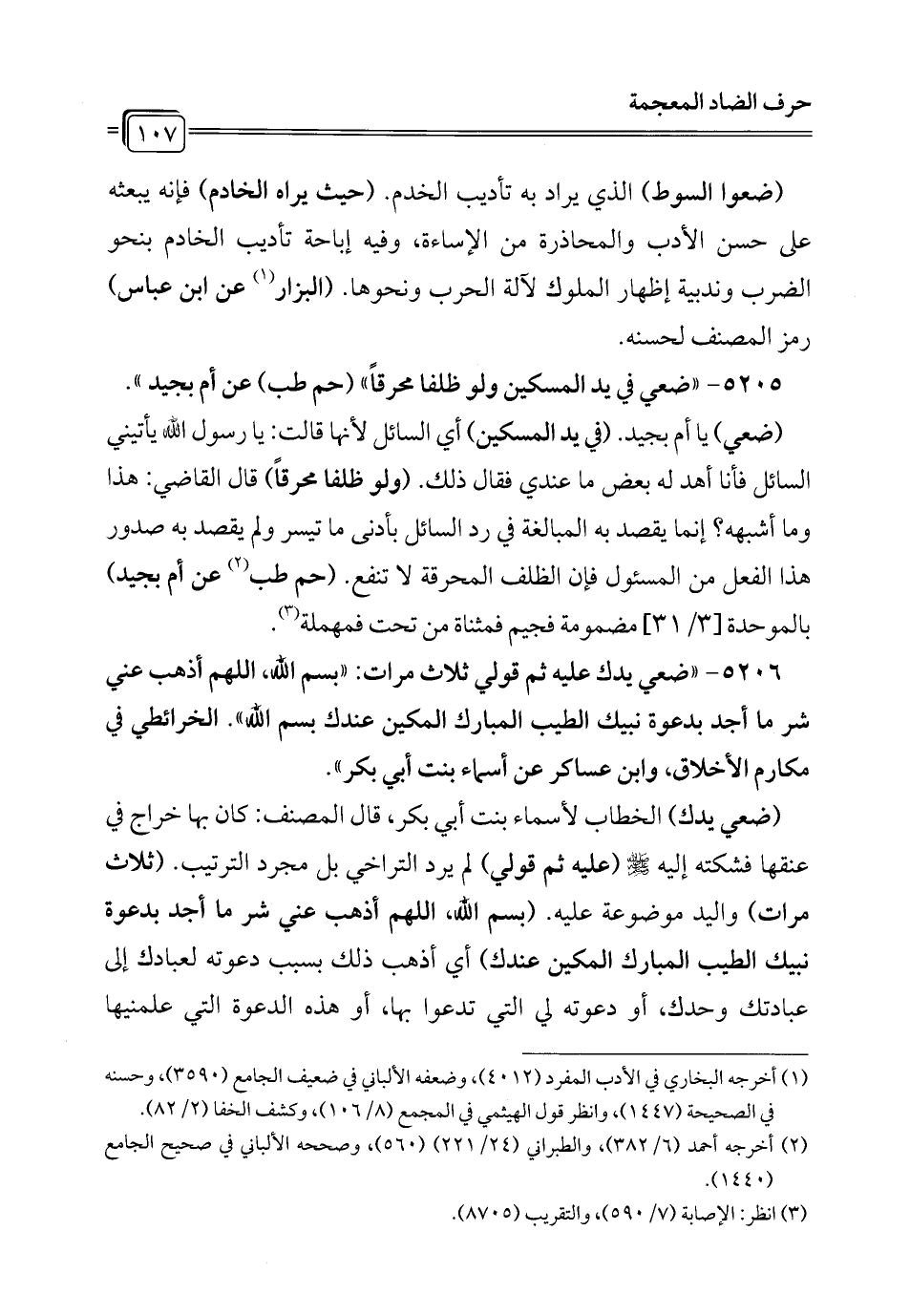 5205 - "ضعي في يد المسكين ولو ظلفا محرقاً" (حم طب) عن أم بجيد".