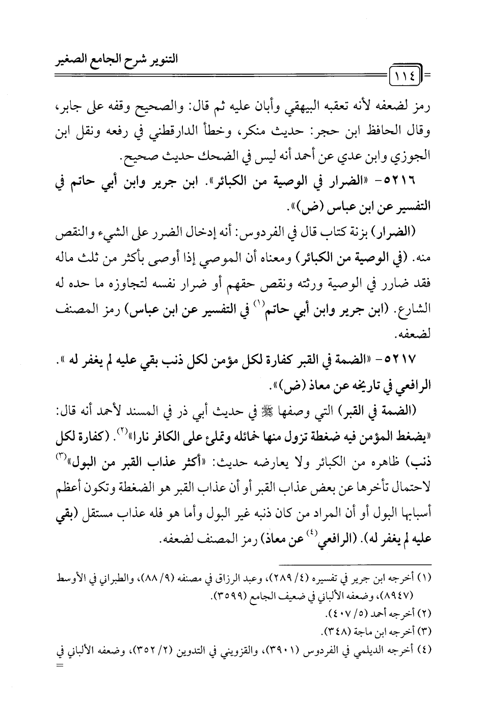 5217 - "الضمة في القبر كفارة لكل مؤمن لكل ذنب بقي عليه لم يغفر له". الرافعي في تاريخه عن معاذ (ض) ".