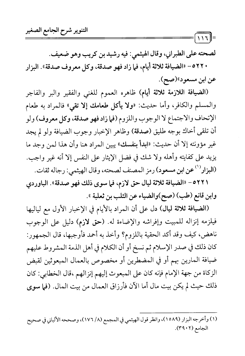 5220 - " الضيافة ثلاثة أيام، فما زاد فهو صدقة، وكل معروف صدقة". البزار عن ابن مسعود" (صح).