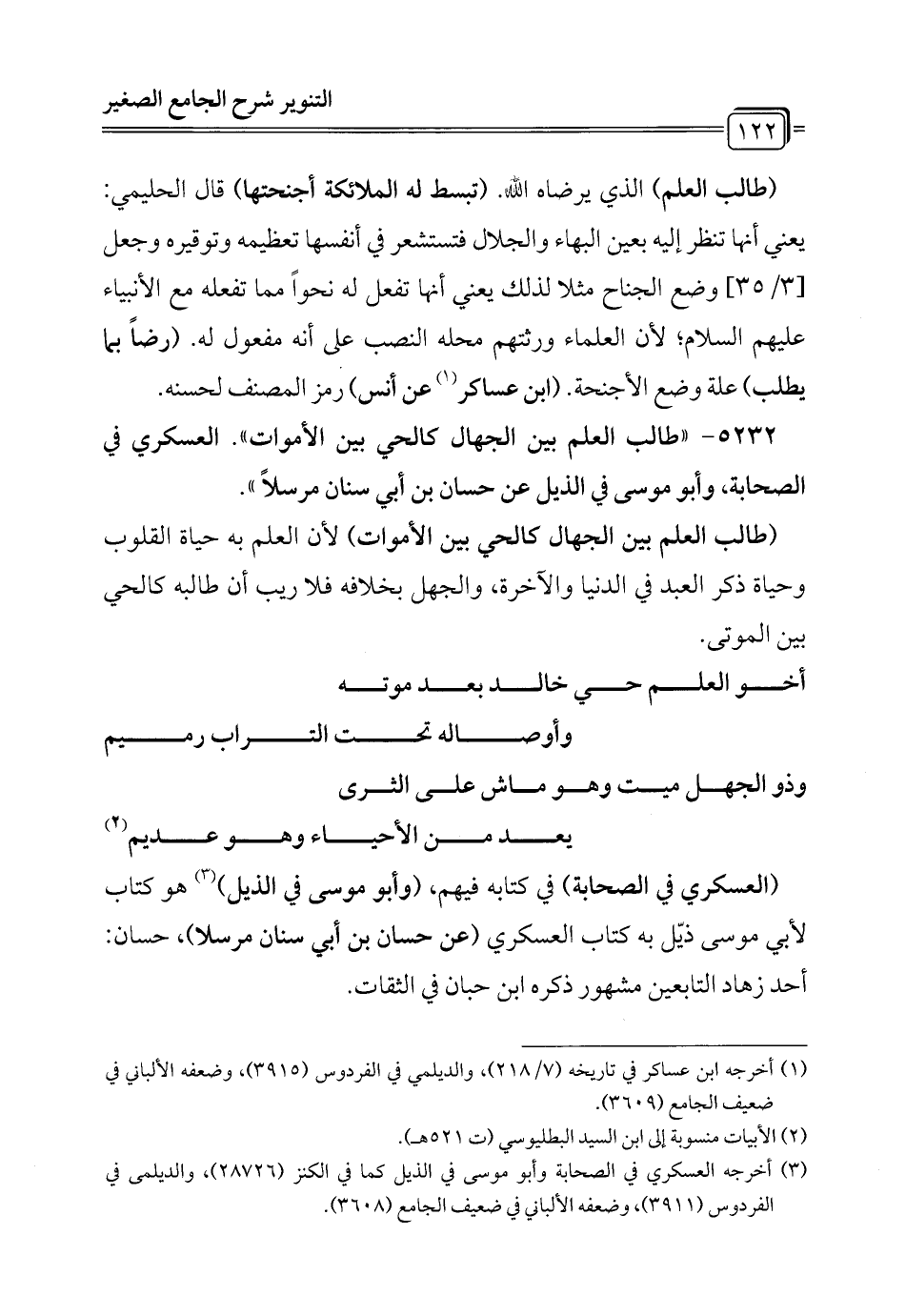 5232 - "طالب العلم بين الجهال كالحي بين الأموات". العسكري في الصحابة، وأبو موسى في الذيل عن حسان بن أبي سنان مرسلاً".
