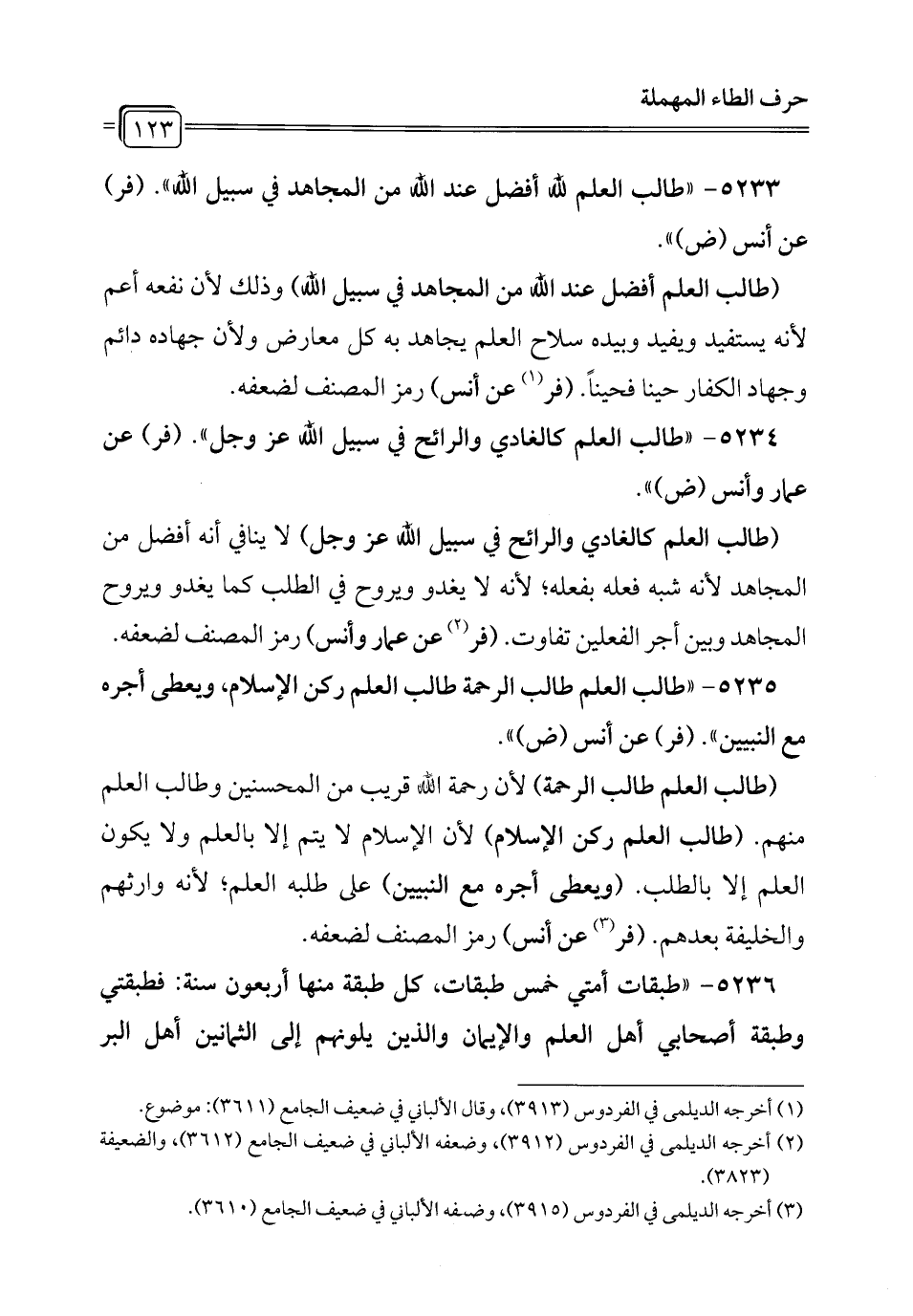 5233 - "طالب العلم لله أفضل عند الله من المجاهد في سبيل الله". (فر) عن أنس (ض) ".