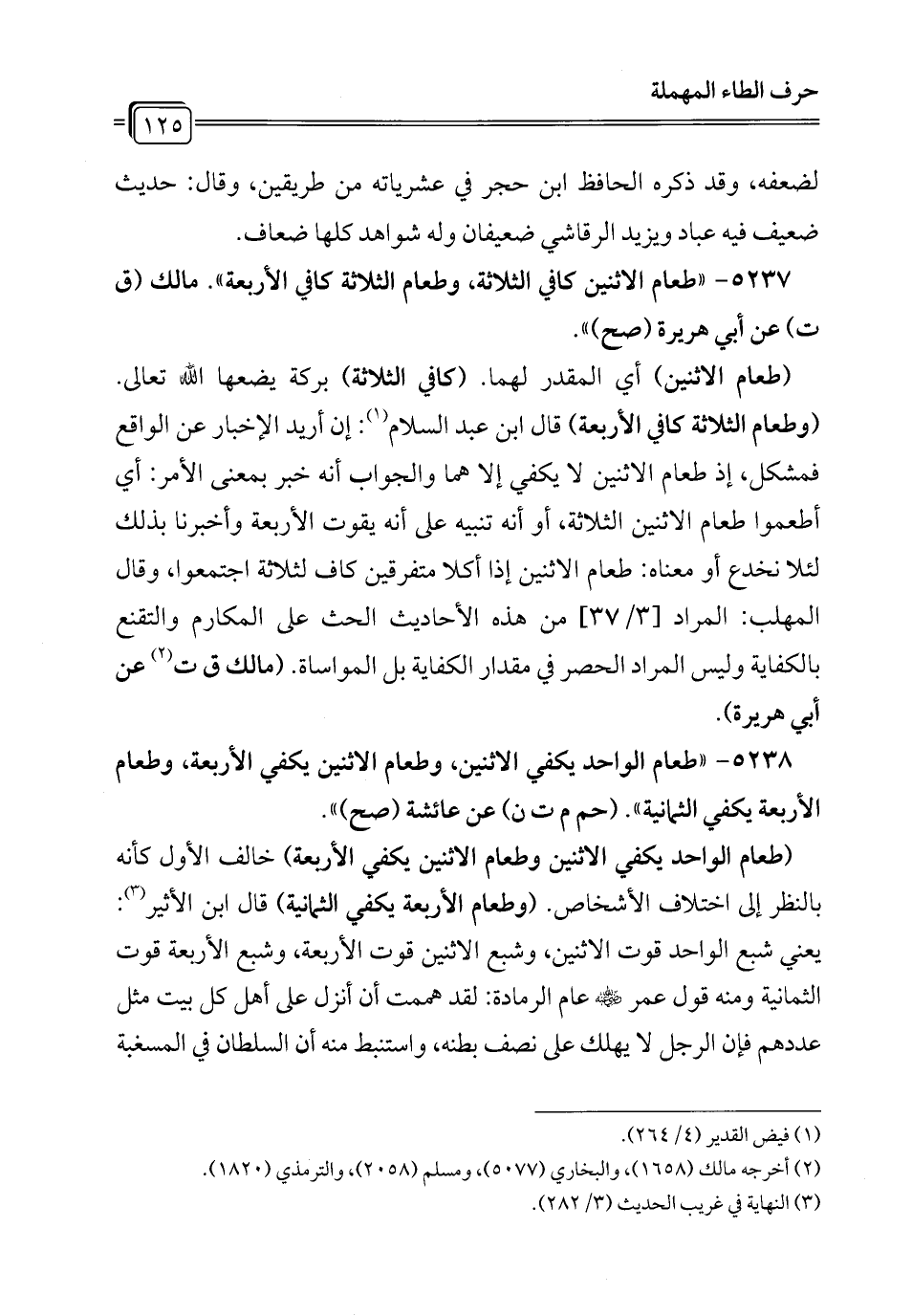 5237 - "طعام الاثنين كافي الثلاثة، وطعام الثلاثة كافي الأربعة". مالك (ق ت) عن أبي هريرة (صح) ".