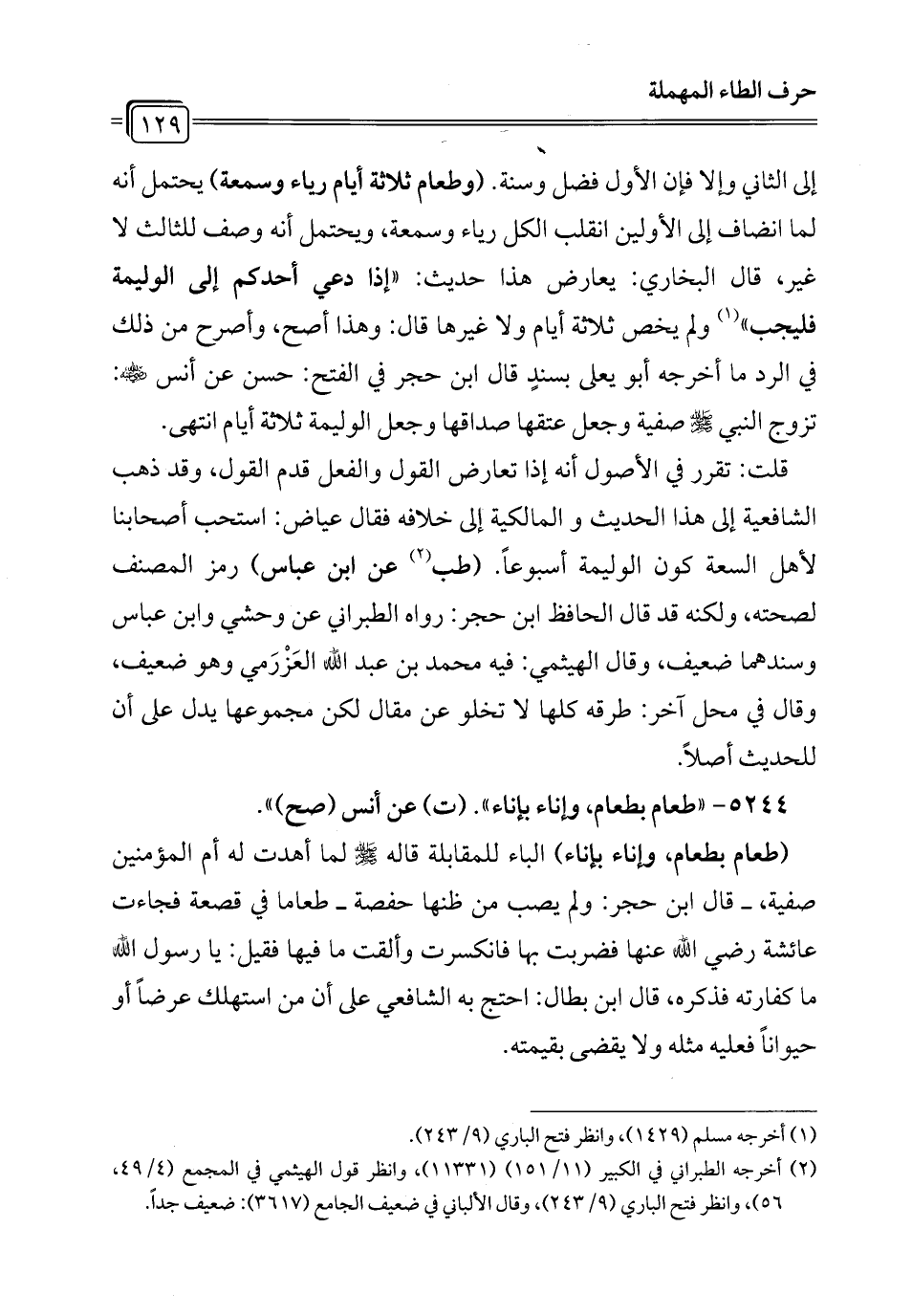 إلى الثاني وإلا فإن الأول فضل وسنة. (وطعام ثلاثة أيام رياء وسمعة) يحتمل أنه لما انضاف إلى الأولين انقلب الكل رياء وسمعة، ويحتمل أنه وصف للثالث لا غير، قال البخاري: يعارض هذا حديث: "إذا دعي أحدكم إلى الوليمة فليجب" (¬1) ولم يخص ثلاثة أيام ولا غيرها قال: وهذا أصح، وأصرح من ذلك في الرد ما أخرجه أبو يعلى بسندٍ قال ابن حجر في الفتح: حسن عن أنس - رضي الله عنه -: تزوج النبي - صلى الله عليه وسلم - صفية وجعل عتقها صداقها وجعل الوليمة ثلاثة أيام انتهى.