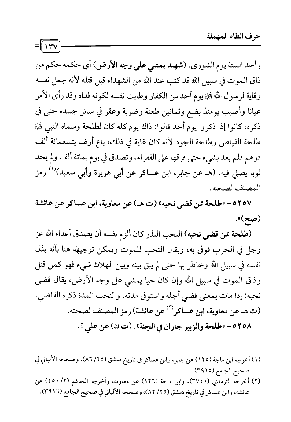 5257 - "طلحة ممن قضى نحبه" (ت هـ) عن معاوية، ابن عساكر عن عائشة (صح) ".