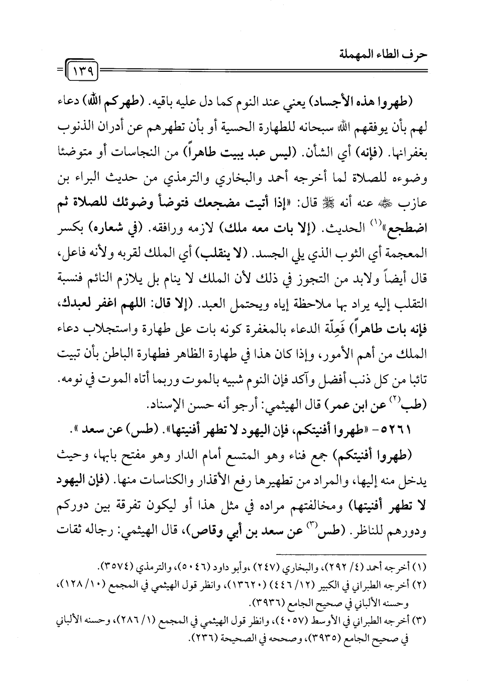 5261 - "طهروا أفنيتكم، فإن اليهود لا تطهر أفنيتها". (طس) عن سعد".