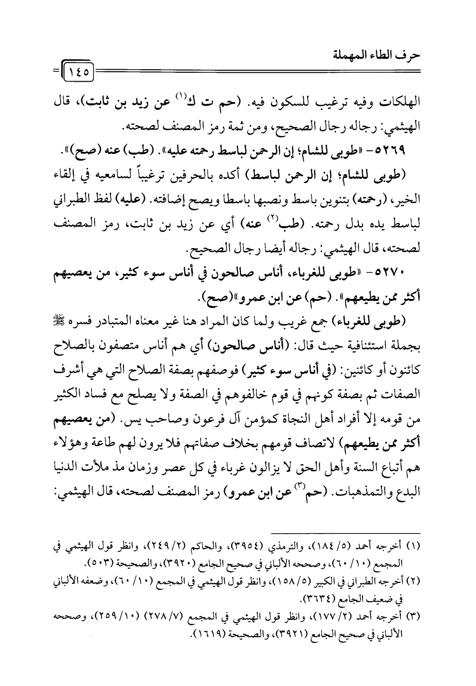 5270 - "طوبى للغرباء، أناس صالحون في أناس سوء كثير، من يعصيهم أكثر ممن يطيعهم". (حم) عن ابن عمرو" (صح).