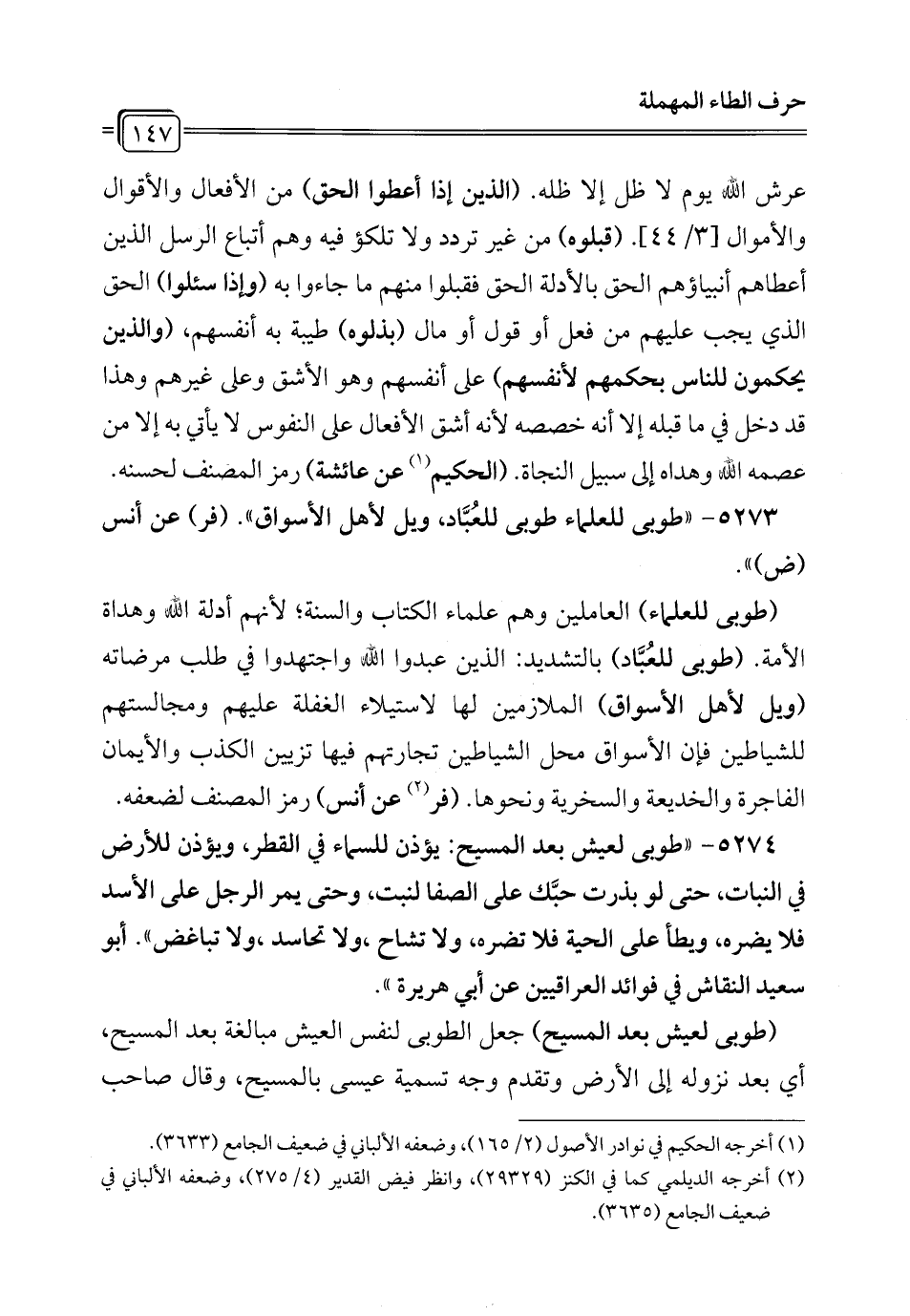 5274 - "طوبى لعيش بعد المسيح: يؤذن للسماء في القطر، ويؤذن للأرض في النبات، حتى لو بذرت حبَّك على الصفا لنبت، وحتى يمر الرجل على الأسد فلا يضره، ويطأ على الحية فلا تضره، ولا تشاح، ولا تحاسد، ولا تباغض". أبو سعيد النقاش في فوائد العراقيين عن أبي هريرة".