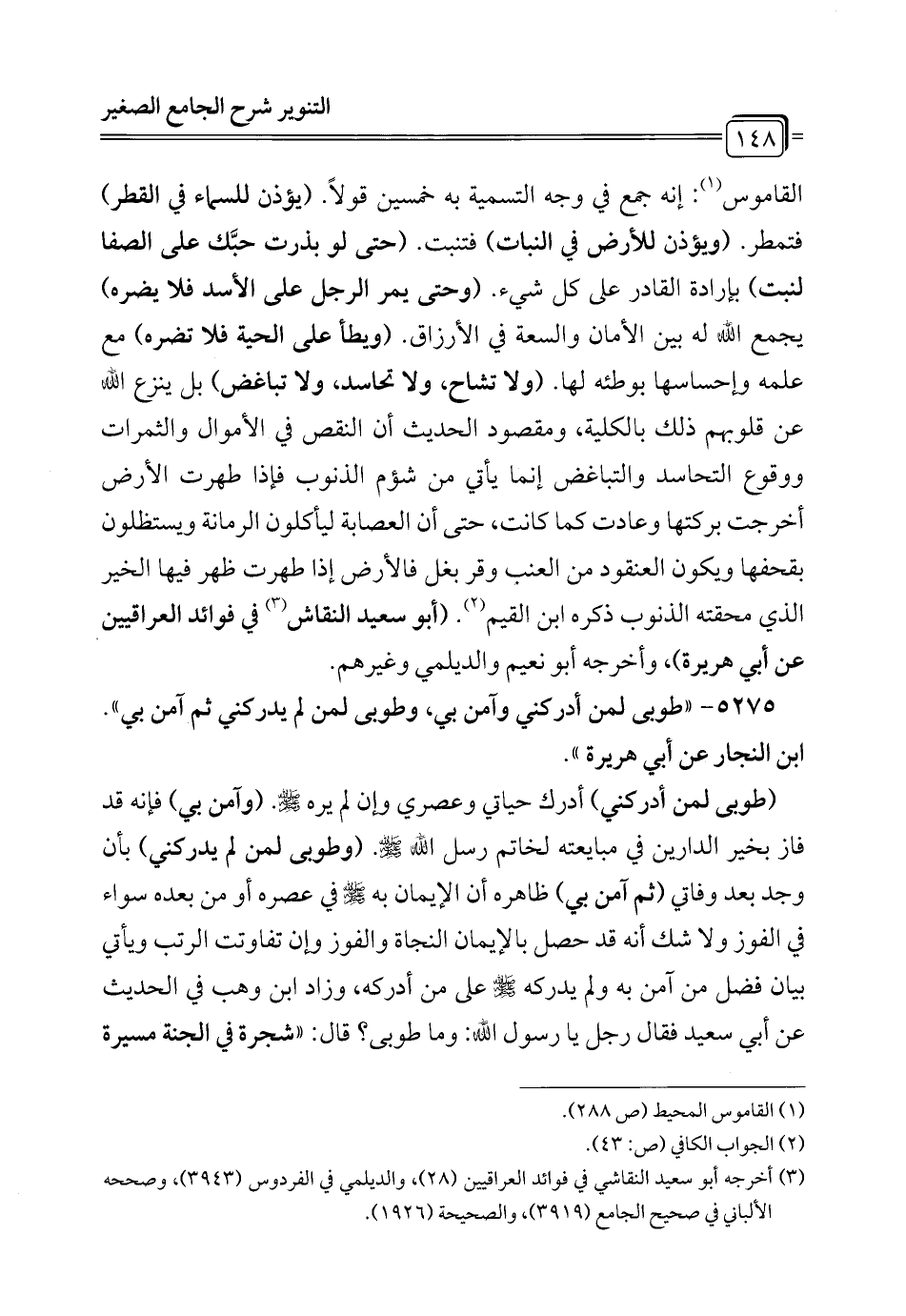 القاموس (¬1): إنه جمع في وجه التسمية به خمسين قولاً. (يؤذن للسماء في القطر) فتمطر. (ويؤذن للأرض في النبات) فتنبت. (حتى لو بذرت حبَّك على الصفا لنبت) بإرادة القادر على كل شيء. (وحتى يمر الرجل على الأسد فلا يضره) يجمع الله له بين الأمان والسعة في الأرزاق. (ويطأ على الحية فلا تضره) مع علمه وإحساسها بوطئه لها. (ولا تشاح، ولا تحاسد، ولا تباغض) بل ينزع الله عن قلوبهم ذلك بالكلية، ومقصود الحديث أن النقص في الأموال والثمرات ووقوع التحاسد والتباغض إنما يأتي من شؤم الذنوب فإذا طهرت الأرض أخرجت بركتها وعادت كما كانت، حتى أن العصابة ليأكلون الرمانة ويستظلون بقحفها ويكون العنقود من العنب وقر بغل فالأرض إذا طهرت ظهر فيها الخير الذي محقته الذنوب ذكره ابن القيم (¬2). (أبو سعيد النقاش (¬3) في فوائد العراقيين عن أبي هريرة)، وأخرجه أبو نعيم والديلمي وغيرهم.