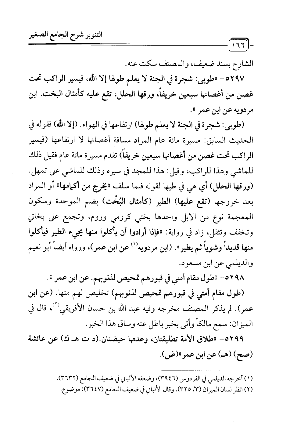 5297 - "طوبى: شجرة في الجنة لا يعلم طولها إلا الله، فيسير الراكب تحت غصن من أغصانها سبعين خريفاً، ورقها الحلل، تقع عليه كأمثال البخت. ابن مردويه عن ابن عمر".