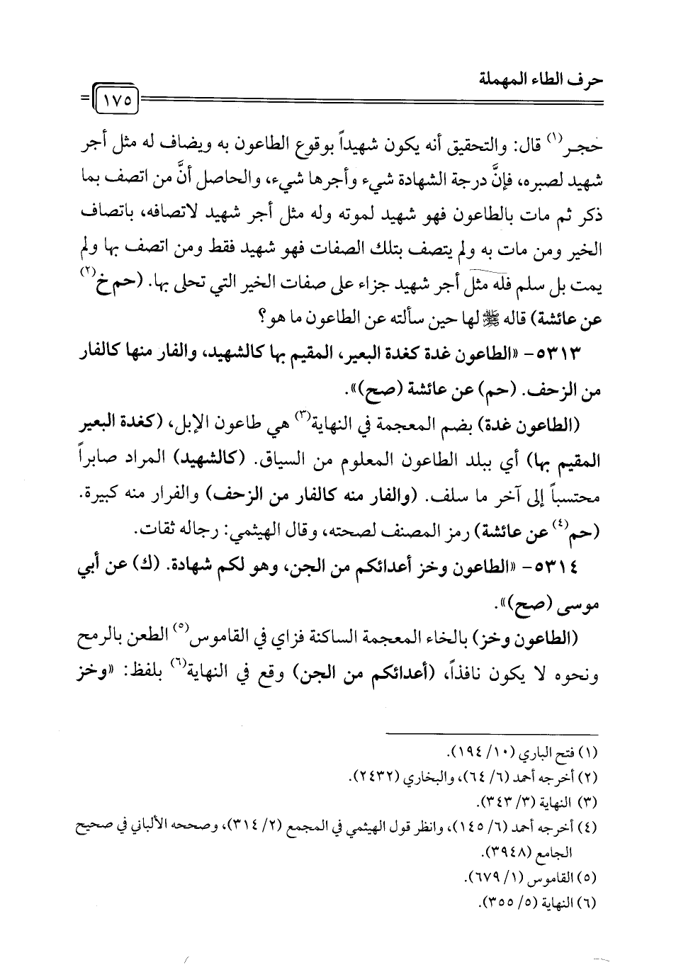 5313 - "الطاعون غدة كغدة البعير، المقيم بها كالشهيد، والفار منها كالفار من الزحف. (حم) عن عائشة (صح) ".