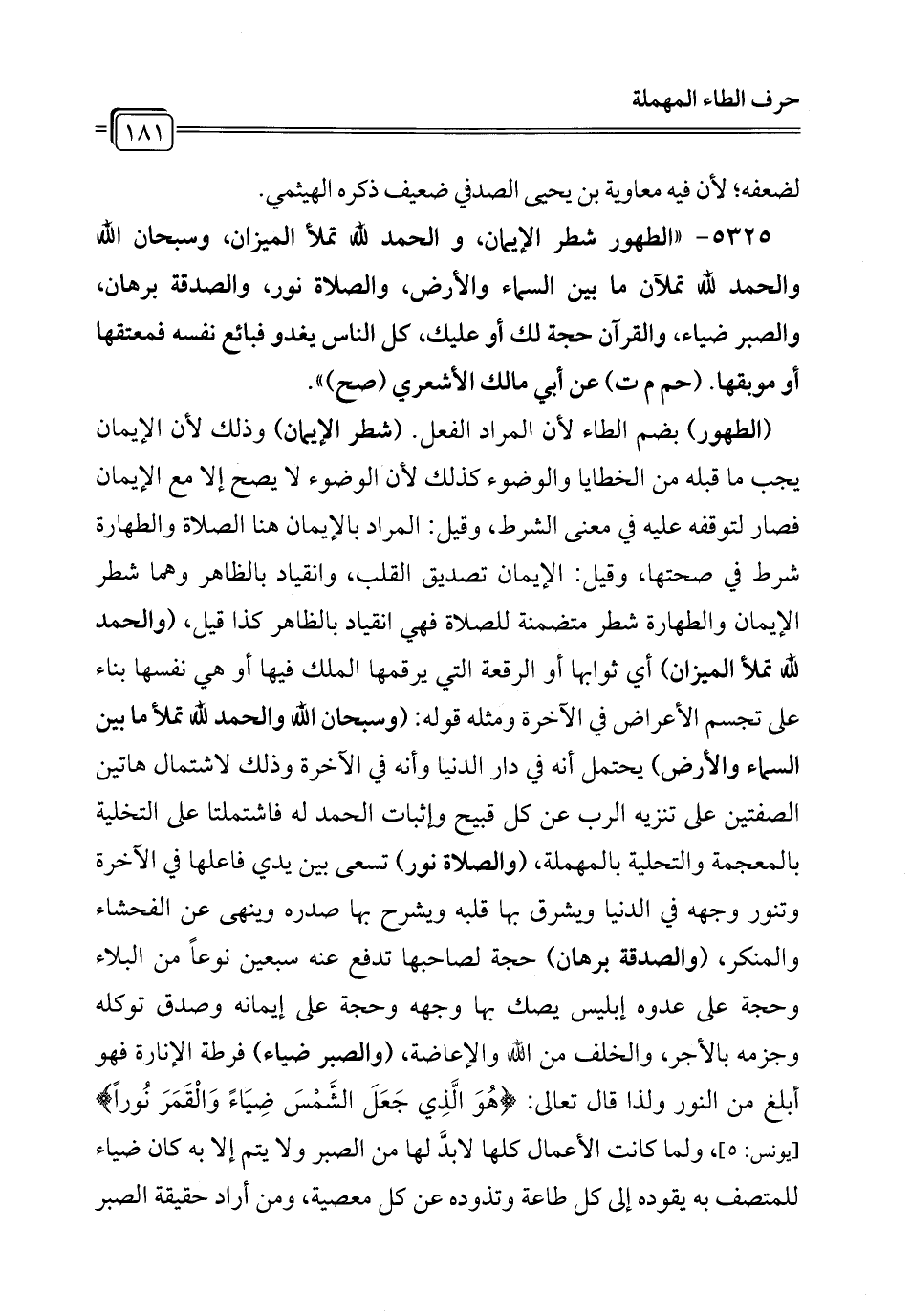 5325 - "الطهور شطر الإيمان، والحمد لله تملأ الميزان، وسبحان الله والحمد لله تملآن ما بين السماء والأرض، والصلاة نور، والصدقة برهان، والصبر ضياء، والقرآن حجة لك أو عليك، كل الناس يغدو فبائع نفسه فمعتقها أو موبقها. (حم م ت) عن أبي مالك الأشعري (صح) ".