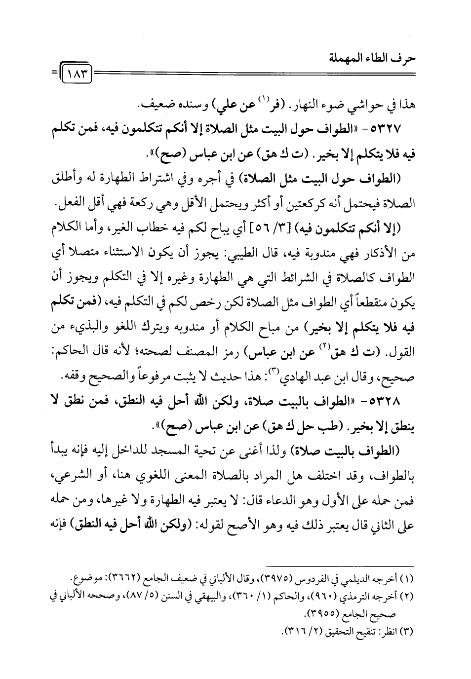 5327 - "الطواف حول البيت مثل الصلاة إلا أنكم تتكلمون فيه، فمن تكلم فيه فلا يتكلم إلا بخير. (ت ك هق) عن ابن عباس (صح) ".