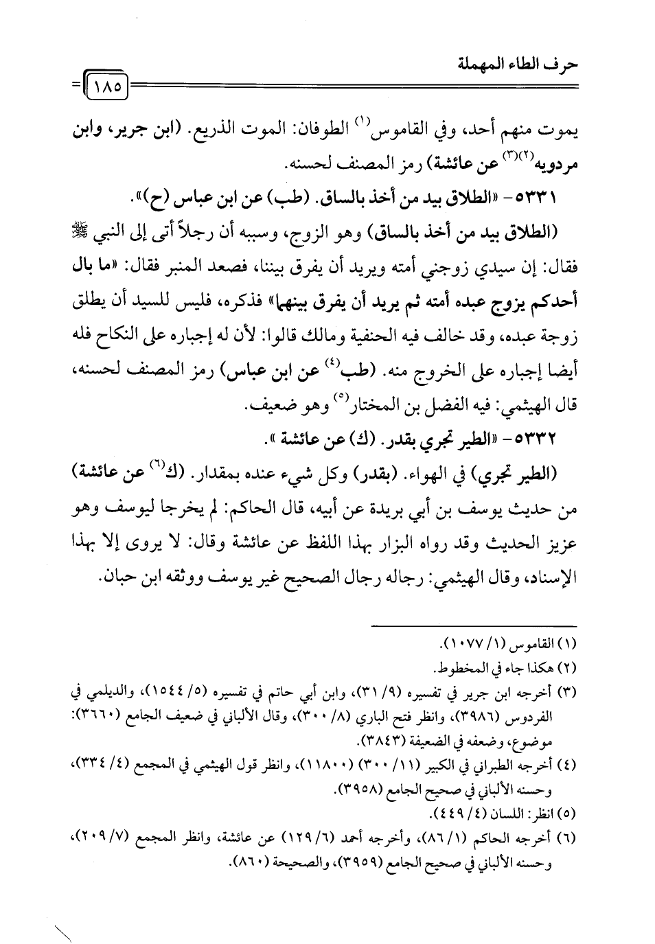 يموت منهم أحد، وفي القاموس (¬1) الطوفان: الموت الذريع. (ابن جرير، وابن مردويه (¬2) (¬3) عن عائشة) رمز المصنف لحسنه.