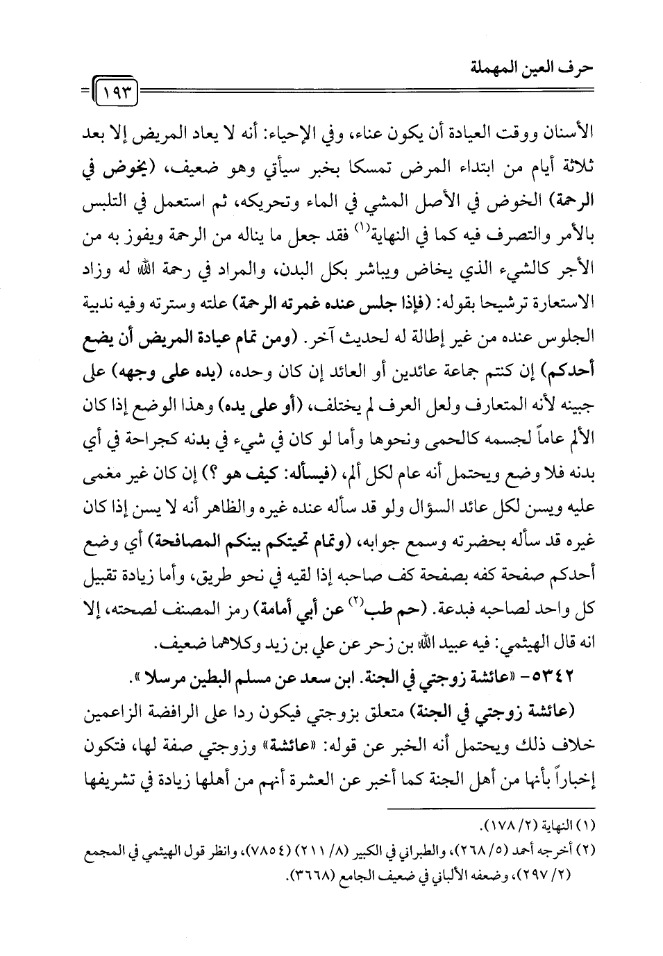 الأسنان ووقت العيادة أن يكون عناء، وفي الإحياء: أنه لا يعاد المريض إلا بعد ثلاثة أيام من ابتداء المرض تمسكا بخبر سيأتي وهو ضعيف، (يخوض في الرحمة) الخوض في الأصل المشي في الماء وتحريكه، ثم استعمل في التلبس بالأمر والتصرف فيه كما في النهاية (¬1) فقد جعل ما يناله من الرحمة ويفوز به من الأجر كالشيء الذي يخاض ويباشر بكل البدن، والمراد في رحمة الله له وزاد الاستعارة ترشيحا بقوله: (فإذا جلس عنده غمرته الرحمة) علته وسترته وفيه ندبية الجلوس عنده من غير إطالة له لحديث آخر. (ومن تمام عيادة المريض أن يضع أحدكم) إن كنتم جماعة عائدين أو العائد إن كان وحده، (يده على وجهه) على جبينه لأنه المتعارف ولعل العرف لم يختلف، (أو على يده) وهذا الوضع إذا كان الألم عاماً لجسمه كالحمى ونحوها وأما لو كان في شيء في بدنه كجراحة في أي بدنه فلا وضع ويحتمل أنه عام لكل ألم، (فيسأله: كيف هو؟) إن كان غير مغمى عليه ويسن لكل عائد السؤال ولو قد سأله عنده غيره والظاهر أنه لا يسن إذا كان غيره قد سأله بحضرته وسمع جوابه، (وتمام تحيتكم بينكم المصافحة) أي وضع أحدكم صفحة كله بصفحة كف صاحبه إذا لقيه في نحو طريق، وأما زيادة تقبيل كل واحد لصاحبه فبدعة. (حم طب (¬2) عن أبي أمامة) رمز المصنف لصحته، إلا أنه قال الهيثمي: فيه عبيد الله بن زحر عن علي بن زيد وكلاهما ضعيف.