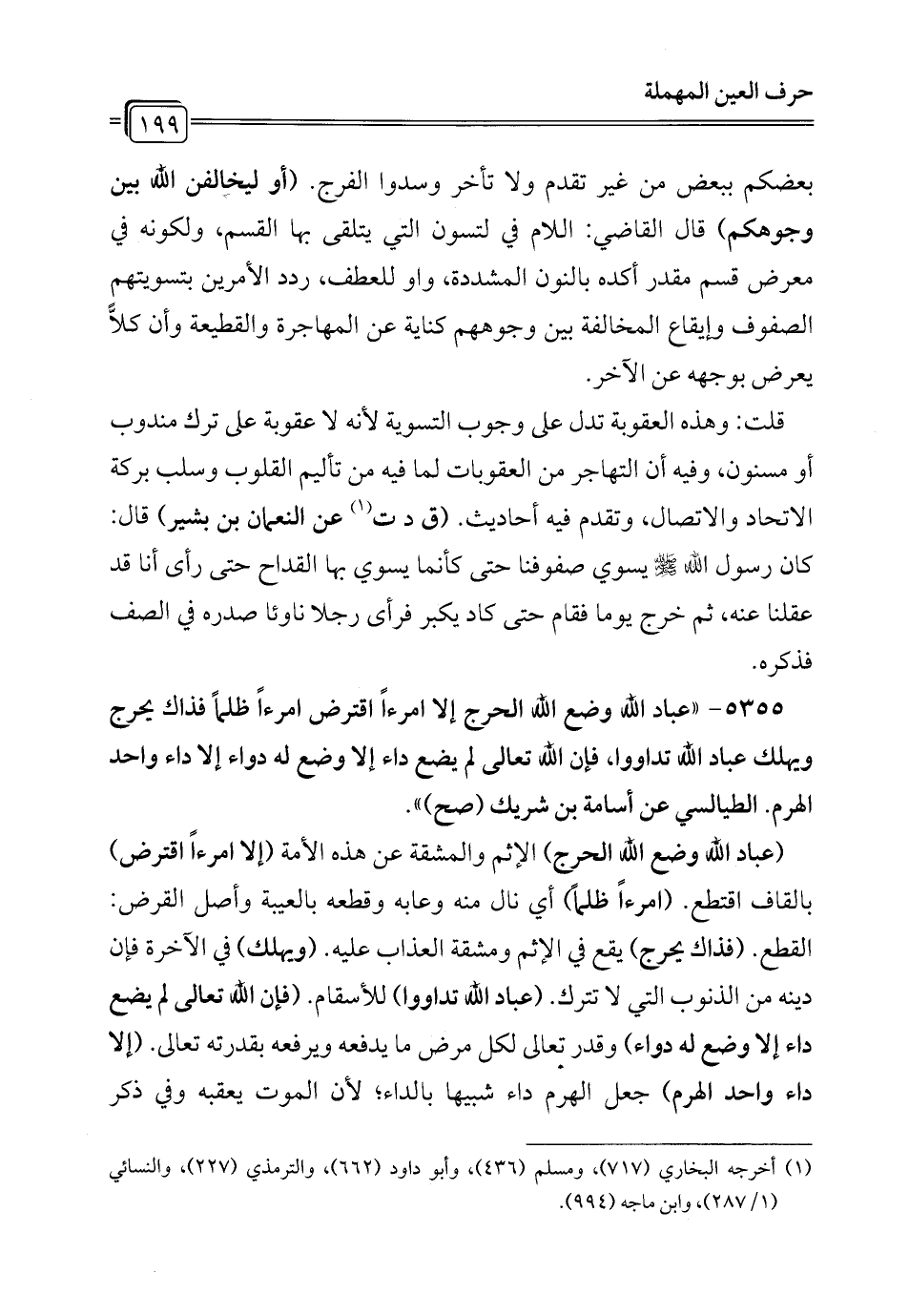 قلت: وهذه العقوبة تدل على وجوب التسوية لأنه لا عقوبة على ترك مندوب أو مسنون، وفيه أن التهاجر من العقوبات لما فيه من تأليم القلوب وسلب بركة الاتحاد والاتصال، وتقدم فيه أحاديث. (ق د ت (¬1) عن النعمان بن بشير) قال: كان رسول الله - صلى الله عليه وسلم - يسوي صفوفنا حتى كأنما يسوي بها القداح حتى رأى أنا قد عقلنا عنه، ثم خرج يوما فقام حتى كاد يكبر فرأى رجلاً ناوئا صدره في الصف فذكره.