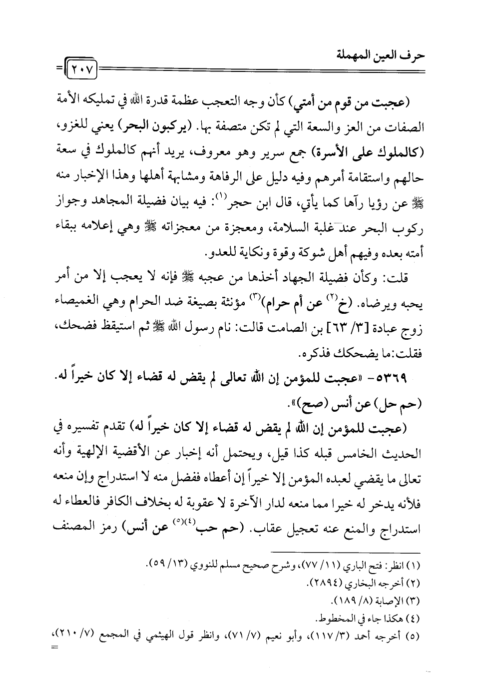 قلت: وكأن فضيلة الجهاد أخذها من عجبه - صلى الله عليه وسلم - فإنه لا يعجب إلا من أمر يحبه ويرضاه. (خ (¬2) عن أم حرام) (¬3) مؤنثة بصيغة ضد الحرام وهي الغميصاء زوج عبادة [3/ 63] بن الصامت قالت: نام رسول الله - صلى الله عليه وسلم - ثم استيقظ فضحك، فقلت: ما يضحكك فذكره.