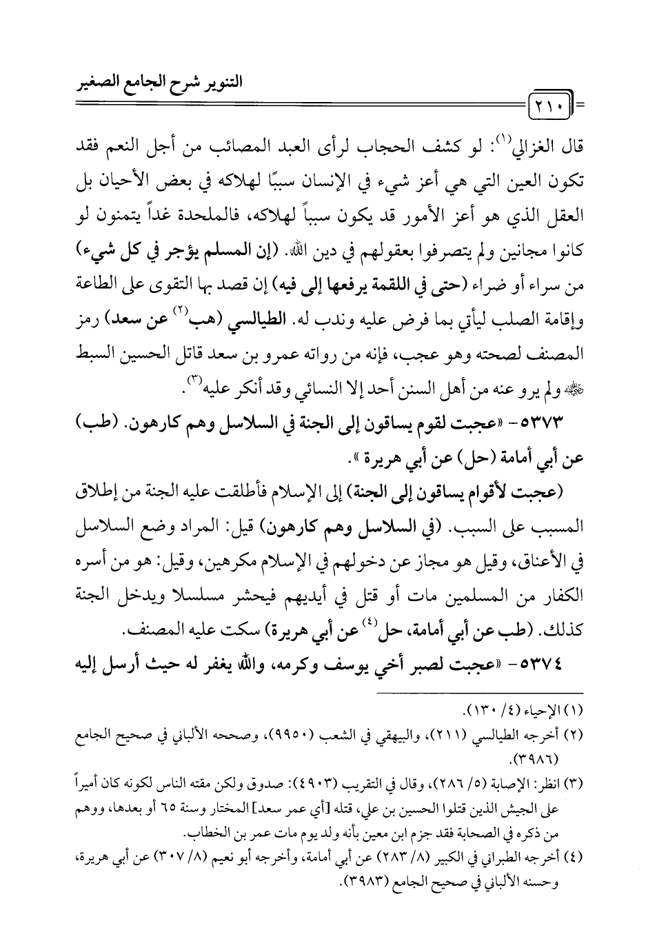 5373 - "عجبت لقوم يساقون إلى الجنة في السلاسل وهم كارهون. (طب) عن أبي أمامة (حل) عن أبي هريرة".