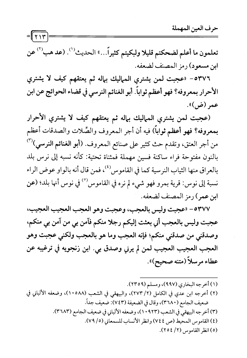 5376 - "عجبت لمن يشتري المماليك بماله ثم يعتقهم كيف لا يشتري الأحرار بمعروفه؟ فهو أعظم ثواباً. أبو الغنائم النرسي في قضاء الحوائج عن ابن عمر (ض) ".