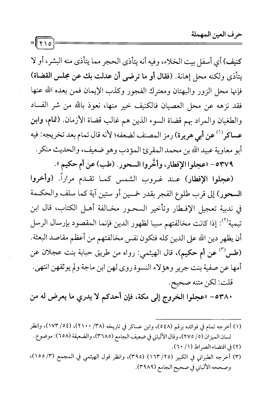 5379 - "عجلوا الإفطار، وأخَّروا السحور. (طب) عن أم حكيم".