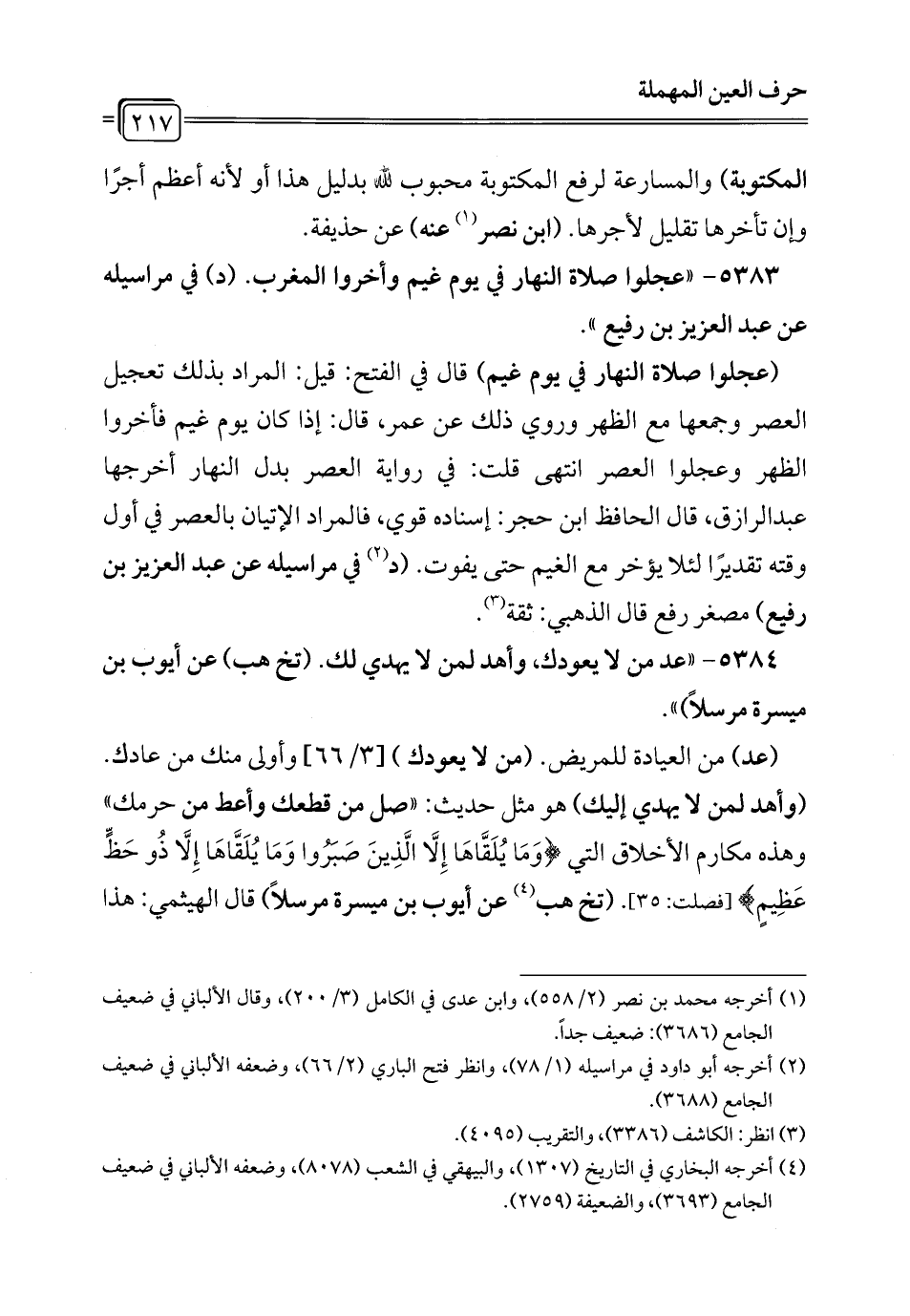 5383 - "عجلوا صلاة النهار في يوم غير وأخروا المغرب. (د) في مراسيله عن عبد العزيز بن رفيع".