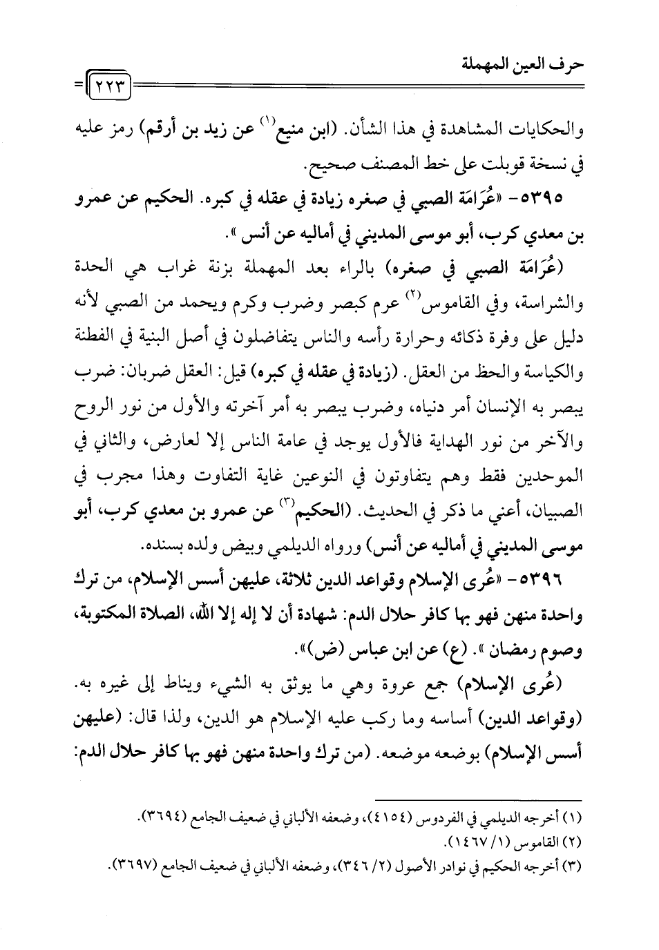 5396 - "عُرى الإسلام وقواعد الدين ثلاثة، عليهن أسس الإسلام، من ترك واحدة منهن فهو بها كافر حلال الدم: شهادة أن لا إله إلا الله، الصلاة المكتوبة، وصوم رمضان". (ع) عن ابن عباس (ض) ".