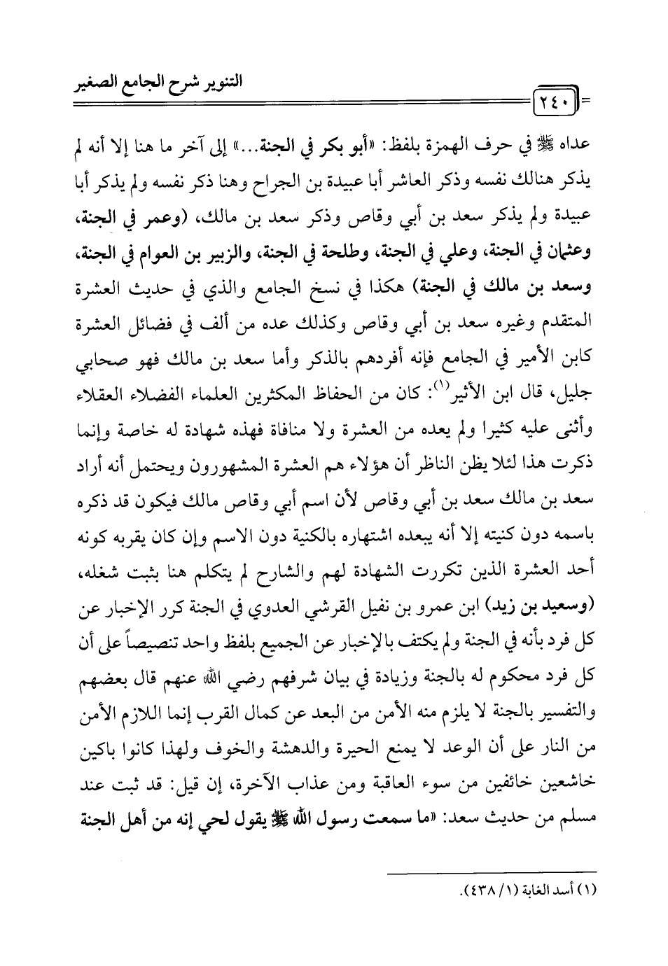 عداه - صلى الله عليه وسلم - في حرف الهمزة بلفظ: "أبو بكر في الجنة ... " إلى آخر ما هنا إلا أنه لم يذكر هنالك نفسه وذكر العاشر أبا عبيدة بن الجراح وهنا ذكر نفسه ولم يذكر أبا عبيدة ولم يذكر سعد بن أبي وقاص وذكر سعد بن مالك، (وعمر في الجنة، وعثمان في الجنة، وعلي في الجنة، وطلحة في الجنة، والزبير بن العوام في الجنة، وسعد بن مالك في الجنة) هكذا في نسخ الجامع والذي في حديث العشرة المتقدم وغيره سعد بن أبي وقاص وكذلك عده من ألف في فضائل العشرة كابن الأمير في الجامع فإنه أفردهم بالذكر وأما سعد بن مالك فهو صحابي جليل، قال ابن الأثير (¬1): كان من الحفاظ المكثرين العلماء الفضلاء العقلاء وأثنى عليه كثيرا ولم يعده من العشرة ولا منافاة فهذه شهادة له خاصة وإنما ذكرت هذا لئلا يظن الناظر أن هؤلاء هم العشرة المشهورون ويحتمل أنه أراد سعد بن مالك سعد بن أبي وقاص لأن اسم أبي وقاص مالك فيكون قد ذكره باسمه دون كنيته إلا أنه يبعده اشتهاره بالكنية دون الاسم وإن كان يقربه كونه أحد العشرة الذين تكررت الشهادة لهم والشارح لم يتكلم هنا بثبت شغله، (وسعيد بن زيد) ابن عمرو بن نفيل القرشي العدوي في الجنة كرر الإخبار عن كل فرد بأنه في الجنة ولم يكتف بالإخبار عن الجميع بلفظ واحد تنصيصاً على أن كل فرد محكوم له بالجنة وزيادة في بيان شرفهم رضي الله عنهم قال بعضهم والتفسير بالجنة لا يلزم منه الأمن من البعد عن كمال القرب إنما اللازم الأمن من النار على أن الوعد لا يمنع الحيرة والدهشة والخوف ولهذا كانوا باكين خاشعين خائفين من سوء العاقبة ومن عذاب الآخرة، إن قيل: قد ثبت عند مسلم من حديث سعد: "ما سمعت رسول الله - صلى الله عليه وسلم - يقول لحي إنه من أهل الجنة