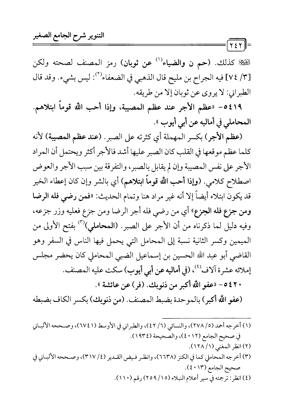 (عظم الأجر) بكسر المهملة أي كثرته على الصبر. (عند عظم المصيبة) لأنه كلما عظم موقعها في القلب كان الصبر عليها أشد فالأجر أكثر ويحتمل أن المراد الأجر على نفس المصيبة وإن لم يقابل بالصبر، والتفرقة بين سبب الأجر والعوض اصطلاح كلامي. (وإذا أحب الله قوماً ابتلاهم) أي بالشر وإن كان إعطاء الخير قد يكون ابتلاء أيضاً إلا أنه غير مراد هنا وتمام الحديث: "فمن رضي فله الرضا ومن جزع فله الجزع" أي من رضي فله أجر الرضا ومن جزع فعليه وزر جزعه، وفيه دليل لما ذكرناه من أن الأجر على الصبر. (المحاملي) (¬3) بفتح الأولى من الميمين وكسر الثانية نسبة إلى المحامل التي يحمل فيها الناس في السفر وهو القاضي أبو عبد الله الحسين بن إسماعيل الضبي المحاملي كان يحضر مجلس إملائه عشرة آلاف (¬4)، (في أماليه عن أبي أيوب) سكت عليه المصنف.