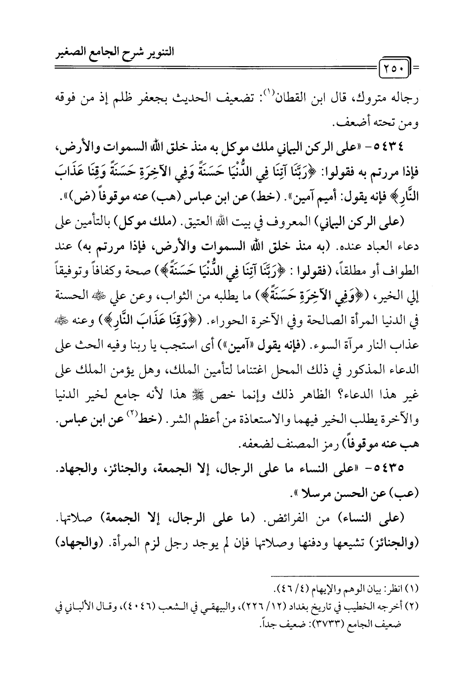 رجاله متروك، قال ابن القطان (¬1): تضعيف الحديث بجعفر ظلم إذ من فوقه ومن تحته أضعف. 5434 - "على الركن اليماني ملك موكل به منذ خلق الله السماوات والأرض، فإذا مررتم به فقولوا: {رَبَّنَا آتِنَا فِي الدُّنْيَا حَسَنَةً وَفِي الْآخِرَةِ حَسَنَةً وَقِنَا عَذَابَ النَّارِ} فإنه يقول: أميم آمين". (خط) عن ابن عباس (هب) عنه موقوفاً (ض) ".