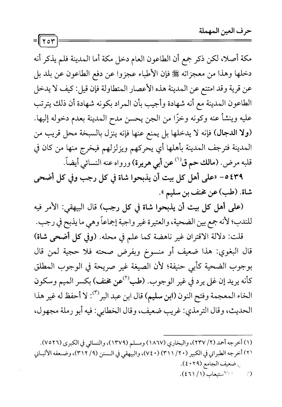 5439 - "على أهل كل بيت أن يذبحوا شاة في كل رجب وفي كل أضحى شاة. (طب) عن مخنف بن سليم".