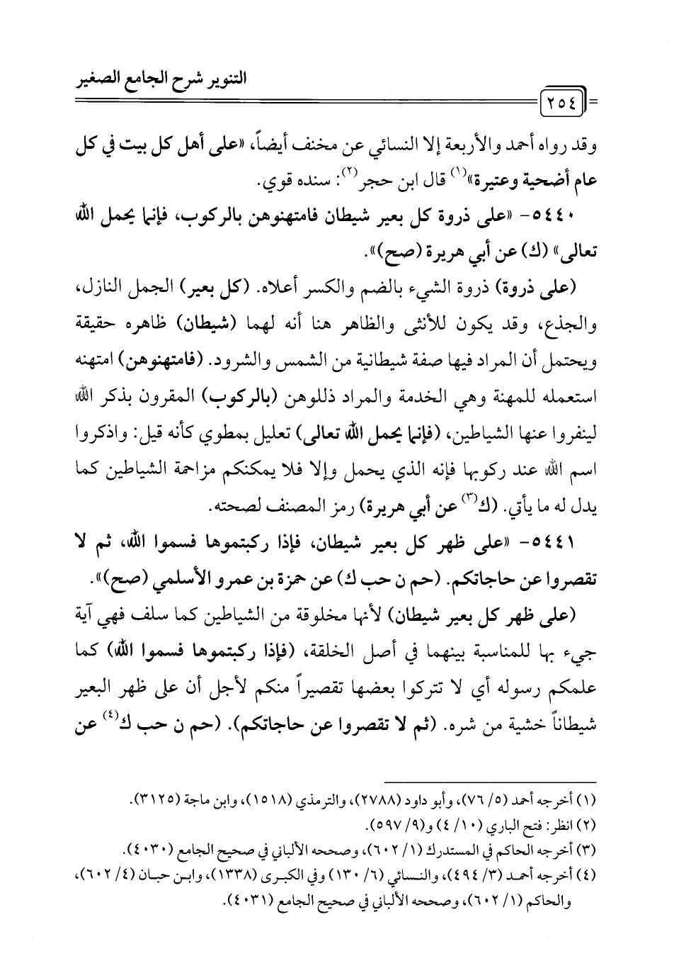 5440 - "على ذروة كل بعير شيطان فامتهنوهن بالركوب، فإنما يحمل الله تعالى" (ك) عن أبي هريرة (صح) ".