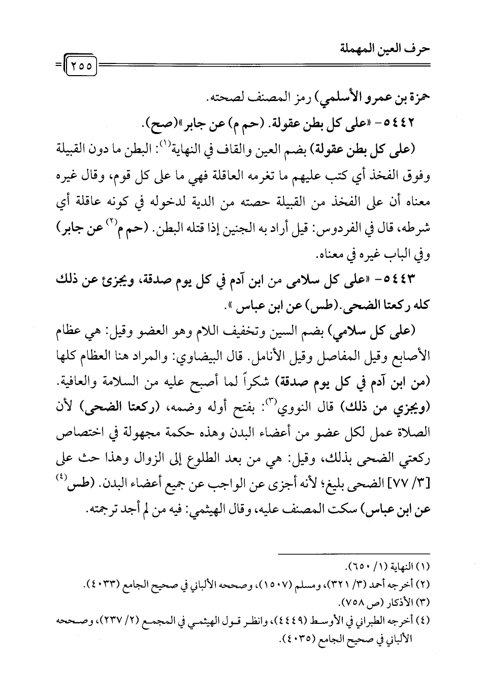 (على كل سلامي) بضم السين وتخفيف اللام وهو العضو وقيل: هي عظام الأصابع وقيل المفاصل وقيل الأنامل. قال البيضاوي: والمراد هنا العظام كلها (من ابن آدم في كل يوم صدقة) شكراً لما أصبح عليه من السلامة والعافية. (ويجزي من ذلك) قال النووي (¬3): بفتح أوله وضمه، (ركعتا الضحى) لأن الصلاة عمل لكل عضو من أعضاء البدن وهذه حكمة مجهولة في اختصاص ركعتي الضحى بذلك، وقيل: هي من بعد الطلوع إلى الزوال وهذا حث على [3/ 77] الضحى بليغ؛ لأنه أجزى عن الواجب عن جميع أعضاء البدن. (طس (¬4) عن ابن عباس) سكت المصنف عليه، وقال الهيثمي: فيه من لم أجد ترجمته.
