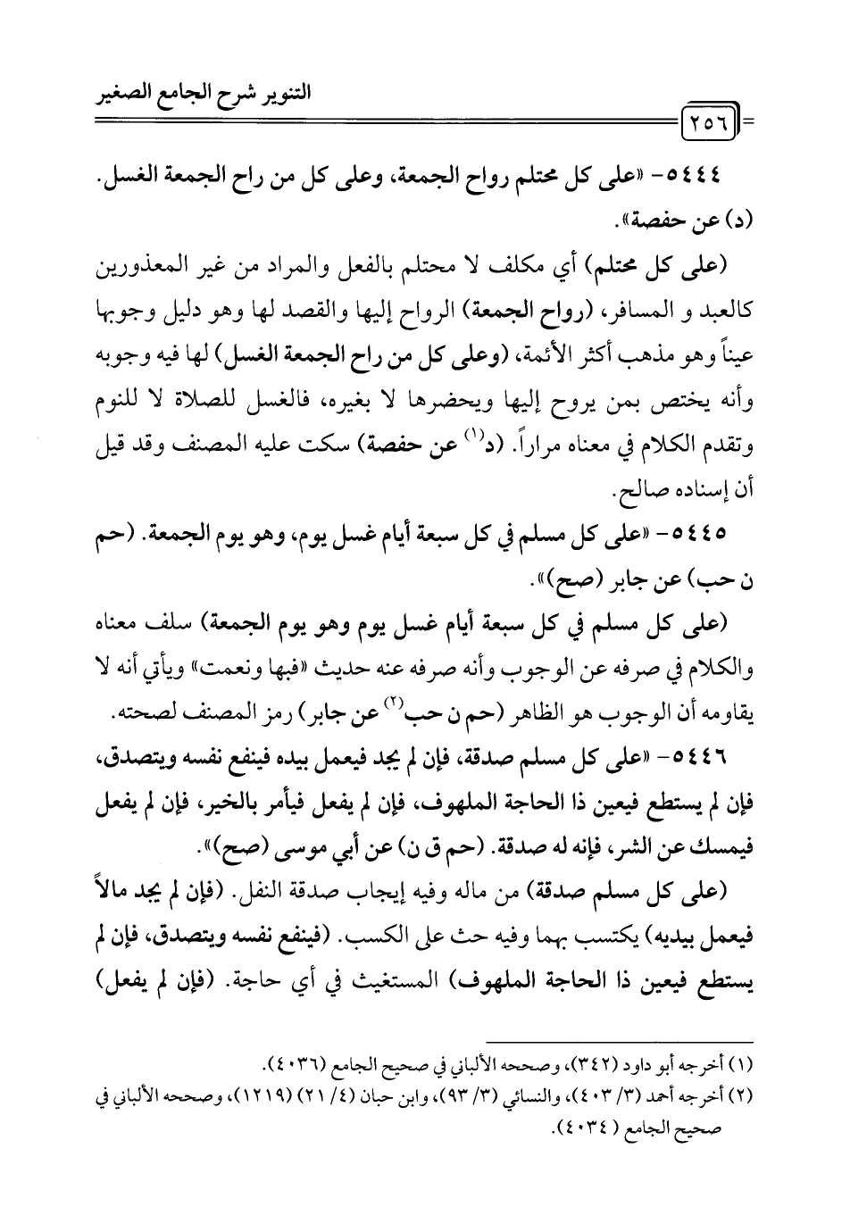 (على كل محتلم) أي مكلف لا محتلم بالفعل والمراد من غير المعذورين كالعبد والمسافر، (رواح الجمعة) الرواح إليها والقصد لها وهو دليل وجوبها عيناً وهو مذهب أكثر الأئمة، (وعلى كل من راح الجمعة الغسل) لها فيه وجوبه وأنه يختص بمن يروح إليها ويحضرها لا بغيره، فالغسل للصلاة لا للنوم وتقدم الكلام في معناه مراراً. (د (¬1) عن حفصة) سكت عليه المصنف وقد قيل أن إسناده صالح.