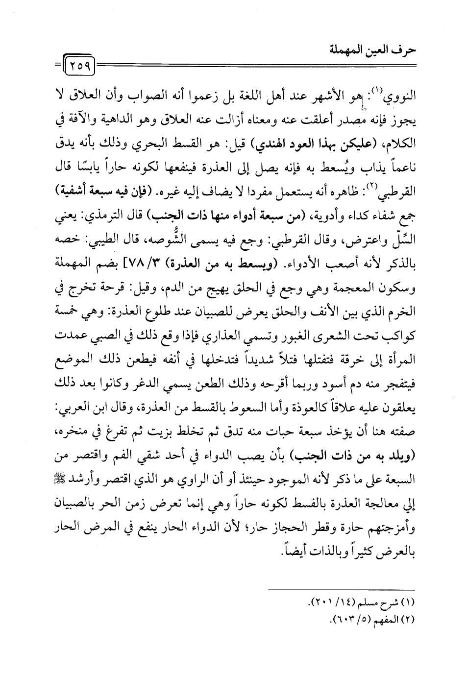 النووي (¬1): هو الأشهر عند أهل اللغة بل زعموا أنه الصواب وأن العلاق لا يجوز فإنه مصدر أعلقت عنه ومعناه أزالت عنه العلاق وهو الداهية والآفة في الكلام، (عليكن بهذا العود الهندي) قيل: هو القسط البحري وذلك بأنه يدق ناعماً يذاب ويُسعط به فإنه يصل إلى العذرة فينفعها لكونه حاراً يابسًا قال القرطبي (¬2): ظاهره أنه يستعمل مفردا لا يضاف إليه غيره. (فإن فيه سبعة أشفية) جمع شفاء كداء وأدوية، (من سبعة أدواء منها ذات الجنب) قال الترمذي: يعني السِّلّ واعترض، وقال القرطبي: وجع فيه يسمى الشُّوصه، قال الطيبي: خصه بالذكر لأنه أصعب الأدواء. (ويسعط به من العذرة) 3/ 78] بضم المهملة وسكون المعجمة وهي وجع في الحلق يهيج من الدم، وقيل: قرحة تخرج في الخرم الذي بين الأنف والحلق يعرض للصبيان عند طلوع العذرة: وهي خمسة كواكب تحت الشعرى الغبور وتسمي العذاري فإذا وقع ذلك في الصبي عمدت المرأة إلى خرقة فتفتلها فتلاً شديداً فتدخلها في أنفه فيطعن ذلك الموضع فيتفجر منه دم أسود وربما أقرحه وذلك الطعن يسمي الدغر وكانوا بعد ذلك يعلقون عليه علاقاً كالعوذة وأما السعوط بالقسط من العذرة، وقال ابن العربي: صفته هنا أن يؤخذ سبعة حبات منه تدق ثم تخلي بزيت ثم تفرغ في منخره، (ويلد به من ذات الجنب) بأن يصب الدواء في أحد شقي الفم واقتصر من السبعة على ما ذكر لأنه الموجود حينئذ أو أن الراوي هو الذي اقتصر وأرشد - صلى الله عليه وسلم - إلى معالجة العذرة بالفسط لكونه حاراً وهي إنما تعرض زمن الحر بالصبيان وأمزجتهم حارة وقطر الحجاز حار؛ لأن الدواء الحار ينفع في المرض الحار بالعرض كثيراً وبالذات أيضاً.
