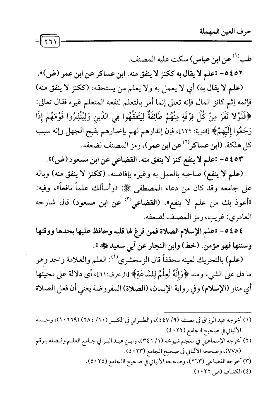 5453 - "علم لا ينفع كنز لا ينفق منه. القضاعي عن ابن مسعود (ض) ".