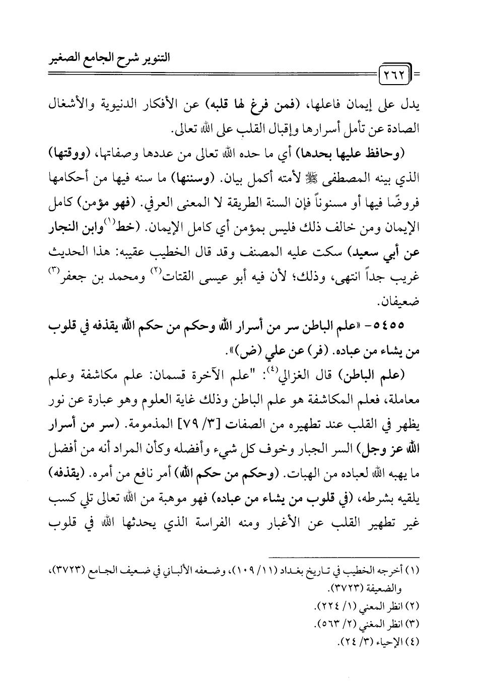 5455 - "علم الباطن سر من أسرار الله وحكم من حكم الله يقذفه في قلوب من يشاء من عباده. (فر) عن علي (ض) ".