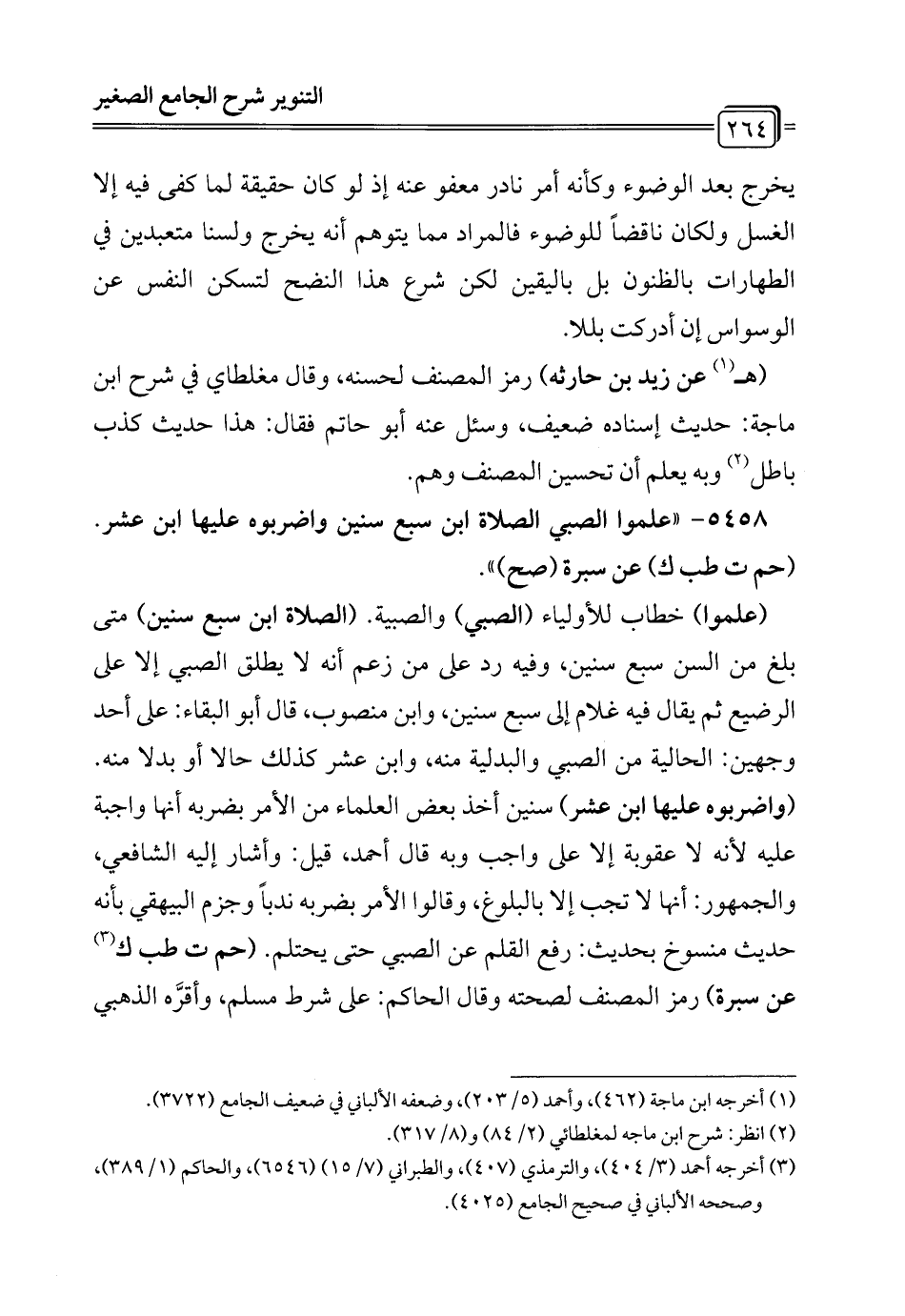 5458 - "علموا الصبي الصلاة ابن سبع سنين واضربوه عليها ابن عشر. (حم ت طب ك) عن سبرة (صح) ".