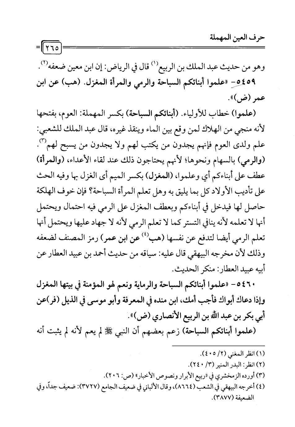 5459 - "علموا أبنائكم السباحة والرمي والمرأة المغزل. (هب) عن ابن عمر (ض) ".