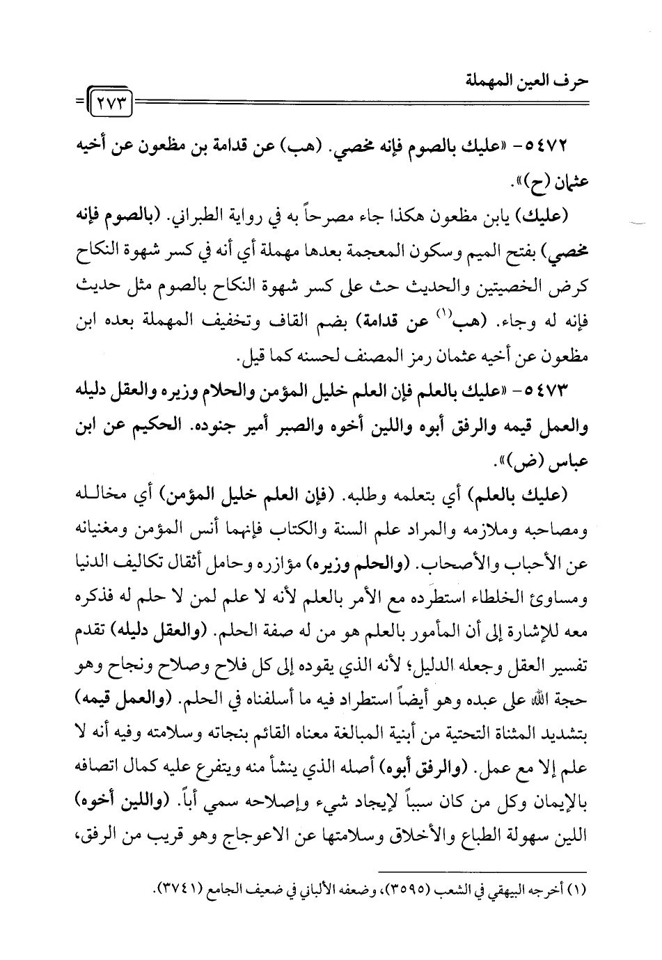 5473 - "عليك بالعلم فإن العلم خليل المؤمن والحلم وزيره والعقل دليله والعمل قيمه والرفق أبوه واللين أخوه والصبر أمير جنوده. الحكيم عن ابن عباس (ض) ".