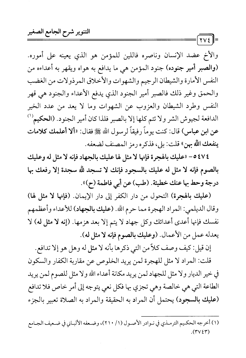 5474 - "عليك بالهجرة فإنها لا مثل لها عليك بالجهاد فإنه لا مثل له وعليك بالصوم فإنه لا مثل له عليك بالسجود فإنك لا تسجد لله سجدة إلا رفعك بها درجة وحط بها عنك خطيئة. (طب) عن أبي فاطمة (ح) ".