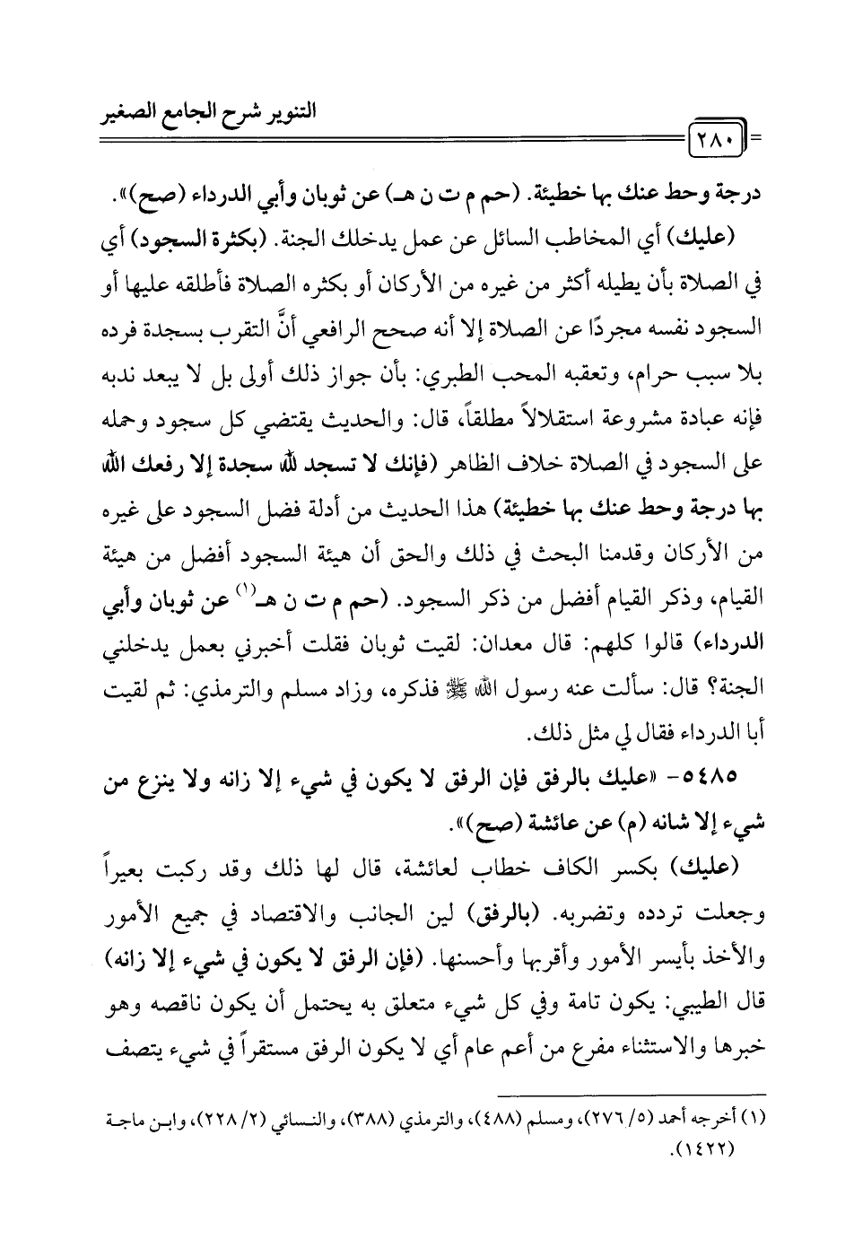(عليك) يا عائشة (بجمل الدعاء وجوامعه) هي ما قل لفظه وكثر معناه التي تجمع الأغراض الصالحة والمقاصد الصحيحة أو التي تجمع الثناء على الله تعالى، وآداب المسألة كأنها قالت: ما أقول؟ فقال: (قولي اللهم إني أسألك من الخير) من ابتدائية ولا يصح أن تكون تبعيضية لقوله: (كله) تأكيد للخبر. (عاجله وآجله) بدل منه والعاجل خير الدنيا والآجل خير الآخرة. (ما علمت منه وما لم أعلم) تعميم بعد تعميم. (وأعوذ بك من الشر كله عاجله وآجله ما علمت منه وما [3/ 86] لم أعلم) هو كل ما سلف. (وأسألك الجنة) تخصيص بعد التعميم، إذ هي من الخير الآجل أو أنها قد انفصلت الجملة الأخرى عن الأولى فهو ابتداء سؤال (وما قرب إليها من قول أو عمل) فإنه لا توفيق إلا بالله وفي عطفه إعلام بأن الجنة لا تدخل إلا بالعمل وفي سؤال دخولها أولاً إعلام بأن العمل وحده لا يكفي في دخولها بل لا بد من فضل الله والعمل الصالح، وقد قدمنا بحثاً في هذا. (وأعوذ بك من النار وما قرب إليها من قول أو عمل) فإنه لا عصمة عن القبائح من الأعمال وصيانة إلا بلطف الله. (وأسألك ما سألك به نبيك محمَّد) ما موصولة أطلبك من الذي طلبك به أي بسببه وهو