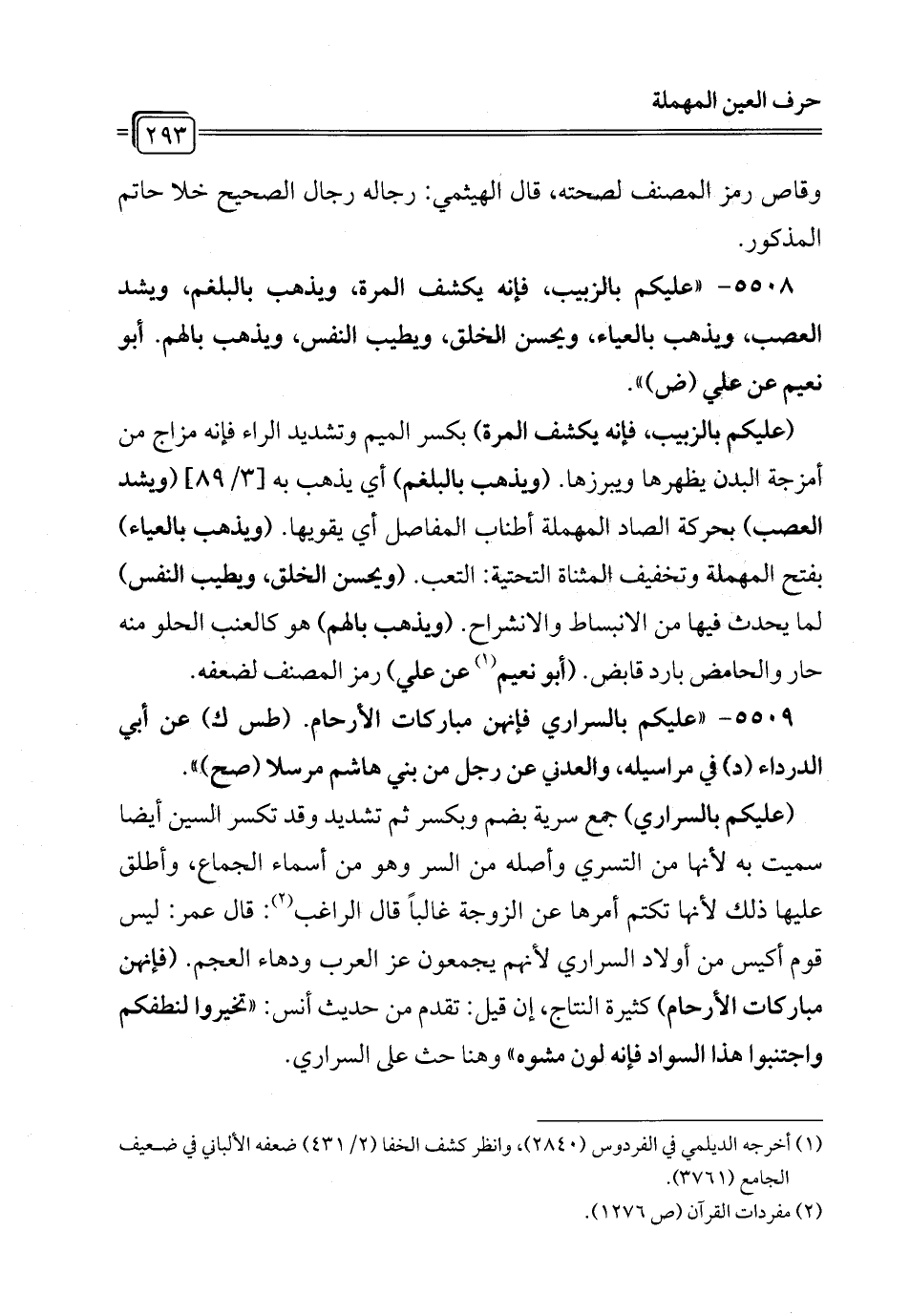 (عليكم بالسنا) بالمد والقصر منافعه كثيرة. (والسنوت) بزنة تنور ويروى بضم المهملة، والفتح أفصح، قيل: العسل، وقيل: الرب، وقيل: الكمون الكرماني، وقد عد ابن القيم (¬1) فيه ثمانية أقوال، وحكى عن بعض الأطباء أن الأجدر بالمعنى والأقرب إلى الصواب أنه العسل الذي يكون في زقاق السمن. (فإن فيهما شفاء من كل داء إلا السام وهو الموت) بالمهملة وهو الموت، فيه أن الموت من الأدواء وطريق استعماله أن يخلط السنا مدقوقاً بالعسل المخالط السمن ثم يلعق فيكون أصلح من استعماله مفردا لما في العسل والسمن من إصلاح السنا وإعانته على الإسهال. (هـ ك (¬2) عن عبد الله بن أم حرام) ضد الحلال، رمز المصنف لصحته؛ لأنه قال الحاكم: صحيح، وتعقَّبه الذَّهبي بأنَّ فيه عمرو بن بكر عن إبراهيم بن أبي عبيدة وعمرو اتهمه ابن حبان وقال ابن عدي: له مناكير (¬3).