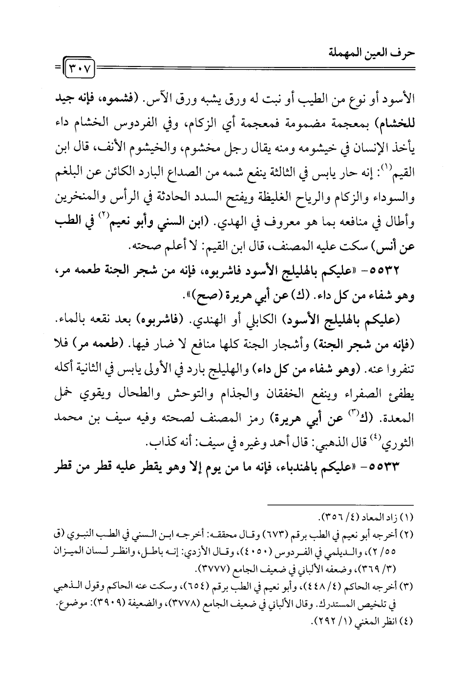 (¬2) أخرجه أبو نعيم في الطب برقم (377)، وقال محققه: وأخرجه ابن السني في الطب (ق 33 أ) والبزار في مسنده (2096)، وضعفه الألباني في ضعيف الجامع (3752)، وقال الألباني في الضعيفة (1407): ضعيف جداً.