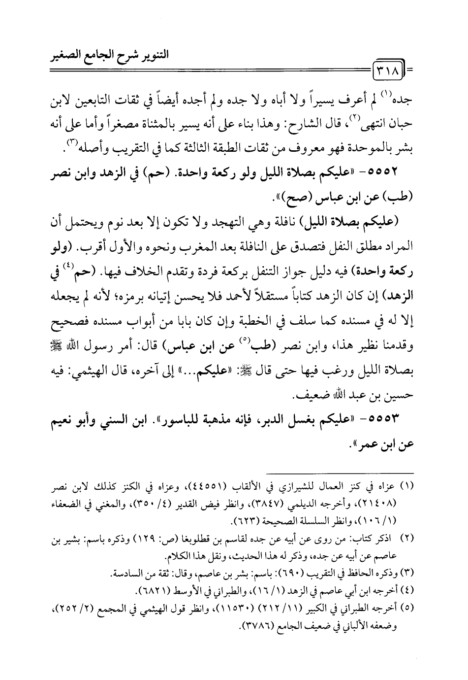 5555 - "عليكم بقيام الليل، فإنه دأب الصالحين قبلكم، وقربة إلى الله تعالى، ومنهاة عن الإثم، وتكفير للسيئات، ومطردة للداء عن الجسد". (حم ت ك هق) عن بلال (ت ك هق) عن أبي أمامة، ابن عساكر عن أبي الدرداء (طب) عن سلمان، ابن السني عن جابر (صح) ".