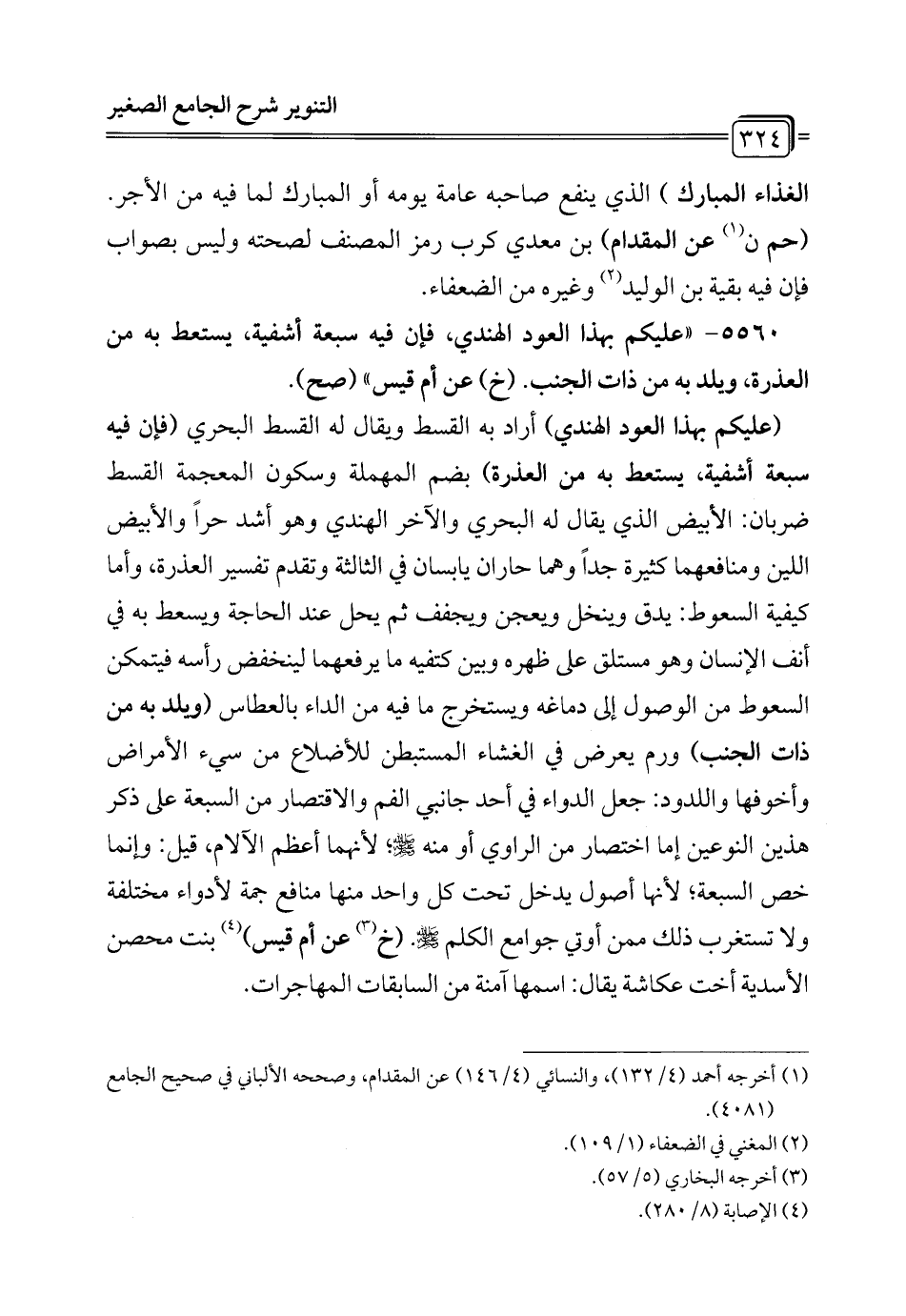 رَبِّهَا} [الأحقاف: 25]. (من كل شيء) أي كل شيء يقبل التدمير، ونظائره وهي نافعه من جميع الأمراض الباردة، ويدخل في الأمراض الحارة اليابسة بالعرض فيوصل قوي الأدوية الباردة الرطبة إليها بسرعة تنفيذها، وقد أطال ابن القيم في عد منافعها. (إلا السام) وهو الموت فإنه لا ينفع منه شيء. (هـ (¬1) عن ابن عمر (ت حب) عن أبي هريرة (حم) عن عائشة) رمز المصنف لصحته، وفي الهدي النبوي (¬2) ساق الحديث بهذا اللفظ الذي ساقه المصنف، وقال: إنه ثبت في الصحيحين من حديث أم سلمة عن أبي هريرة، فكان نسبته إليهما أولى.